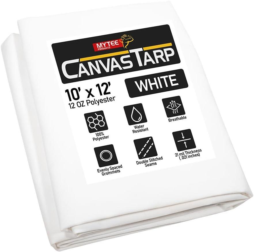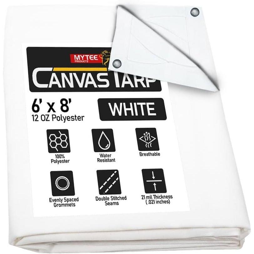 • Heavy Duty water resistant 6' x 8' (finished size) Canvas Tarps from Mytee Products are made with 12 Oz Polyester Material.