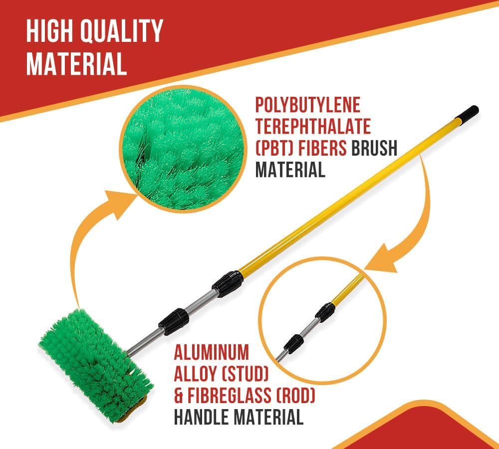Are you looking for smooth and convenient brushes to wash your vehicles? Here’s Mytee Products' multifunctional 10″ Green Bi-Level Car Wash Brush with a Handle – Extends 4-1/2' to 8'. The gentle yet strong brush offers wide application, enabling you to clean your cars, trucks, SUVs, RV, camper, deck boat, etc., efficiently. The unique bi-level bristles design helps you clear grime in corners and tight spots. Our brush includes a handle to reach different heights and spots. It includes more features and USPs; explore below:-