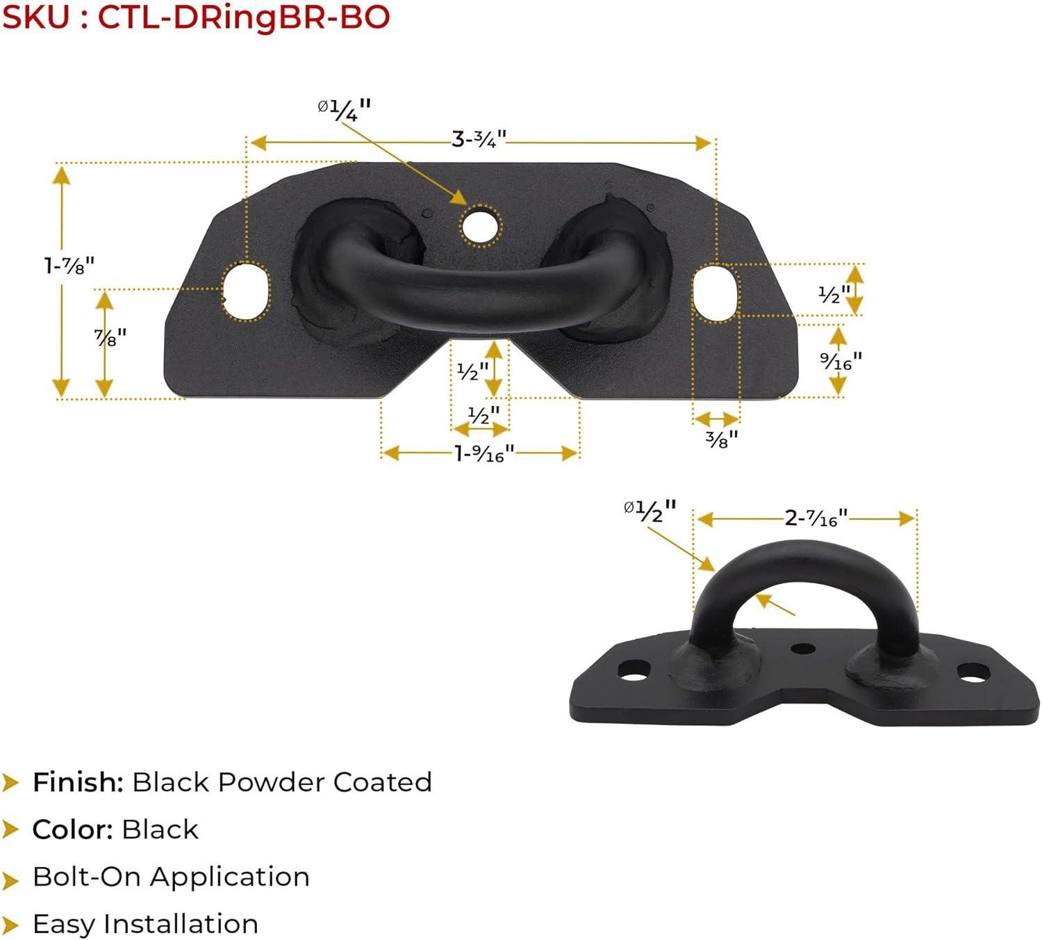 - Measurements: These D-rings have a 1/2-inch diameter, the bottom plate has a thickness of 5 mm, and the bolt holes on the sides have a diameter of 7/16″ each. Meanwhile, the bolt hole in the middle of the plate has a diameter of 1/4″.