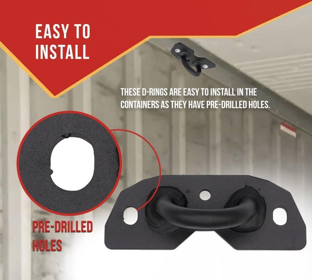 - Easy to Install: These D-rings are easy to install in the containers as they have pre-drilled holes. However, you will need a few tools and installation hardware (we are not selling it with the product) during installation. For example, self-tapping bolts (if you do not want to put holes in the container), and self-taping screws (screws will directly drill space in the container, eliminating the need for a driller).