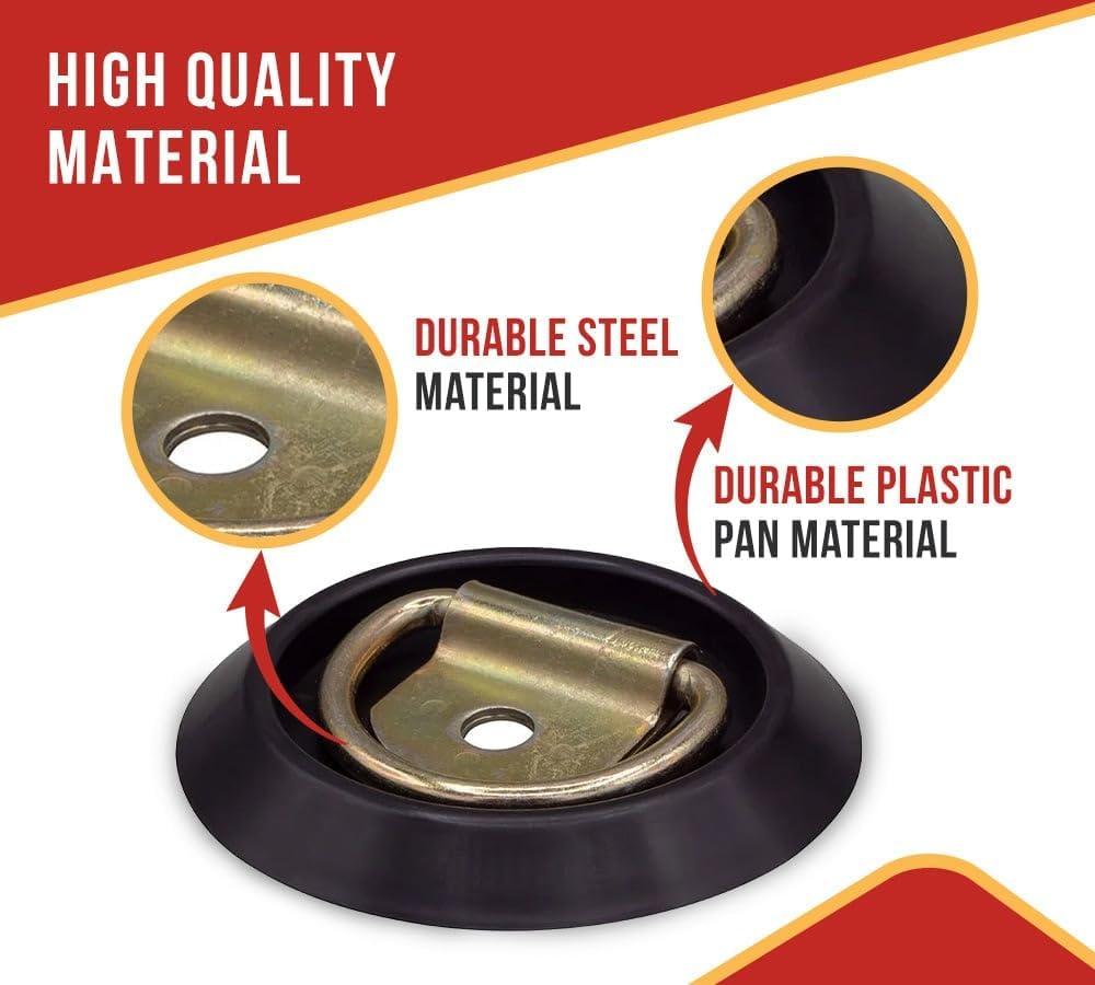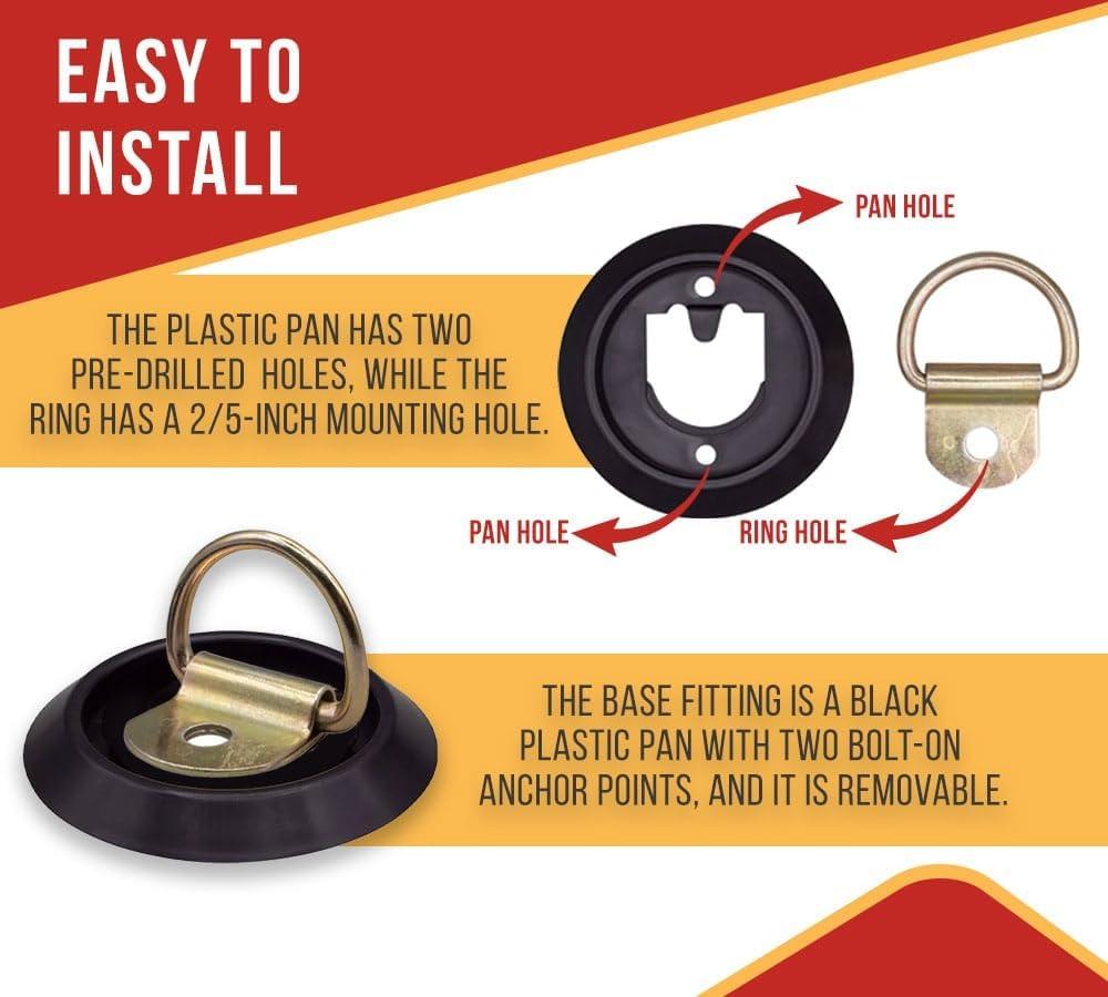 • No Welding, Easy-to-Install: Our flush mount D-rings are designed for everyday use and are easy to install. We’ve pre-drilled holes for convenience. The plastic pan has two holes, and the ring has a 2/5-inch mounting hole for a secure and reliable anchor point to different project requirements.