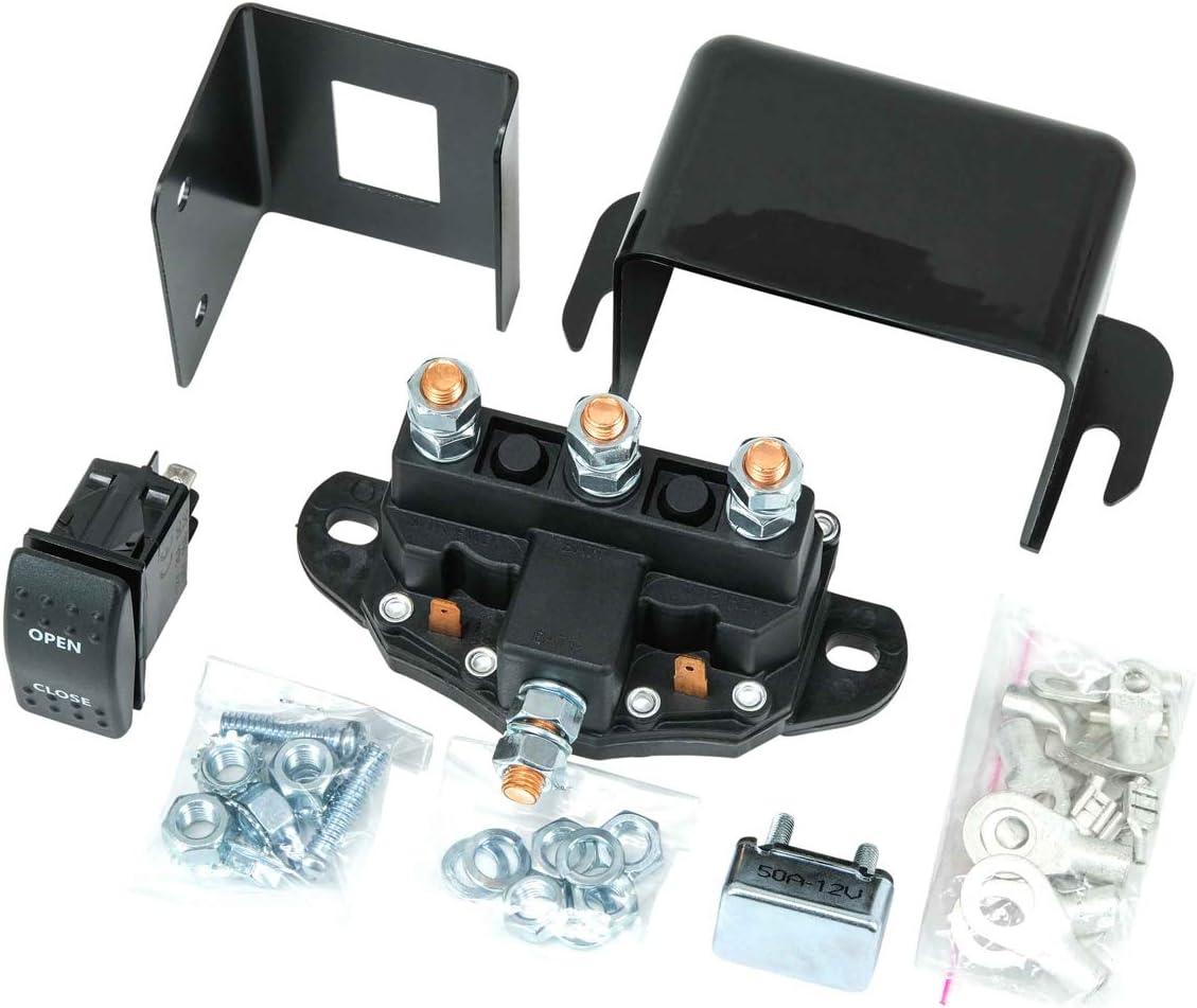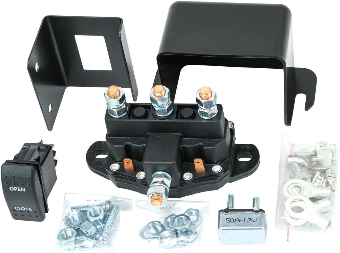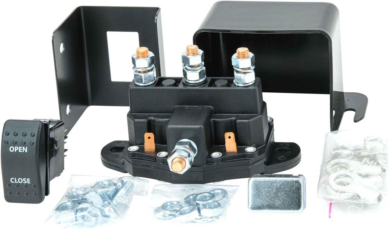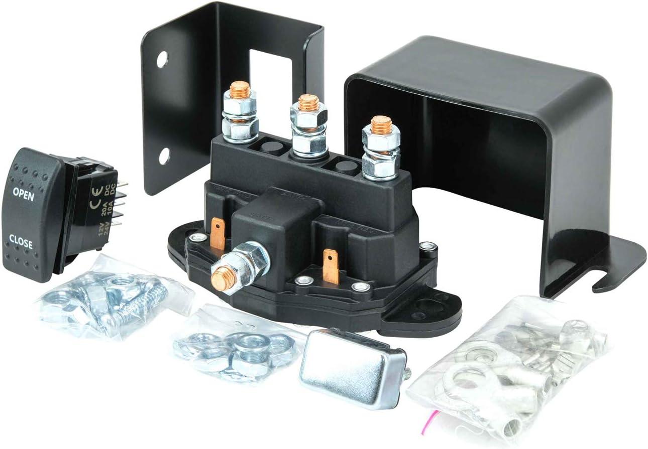Kit Includes: 12V Grounded Motor and Rocker Style Switch, Weatherproof Solenoid Terminal, Terminal Rings, Mounting Plates, Mounting Hardware