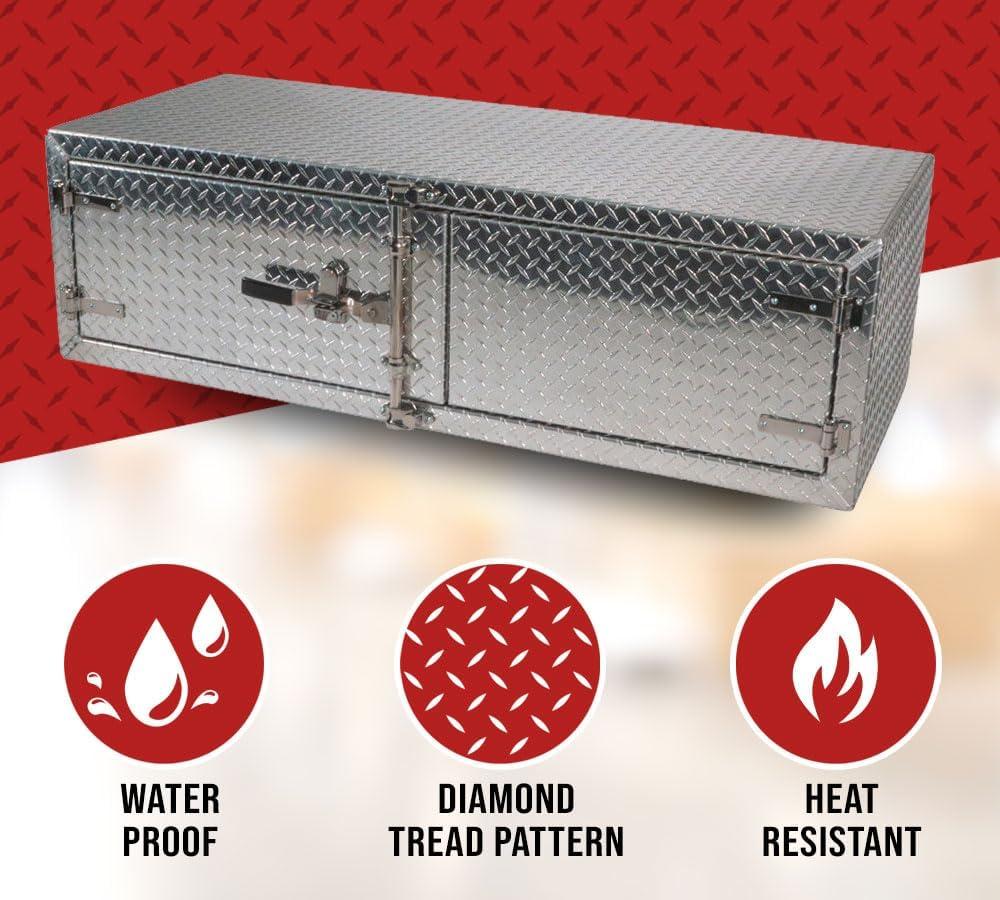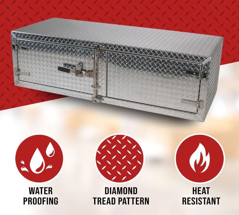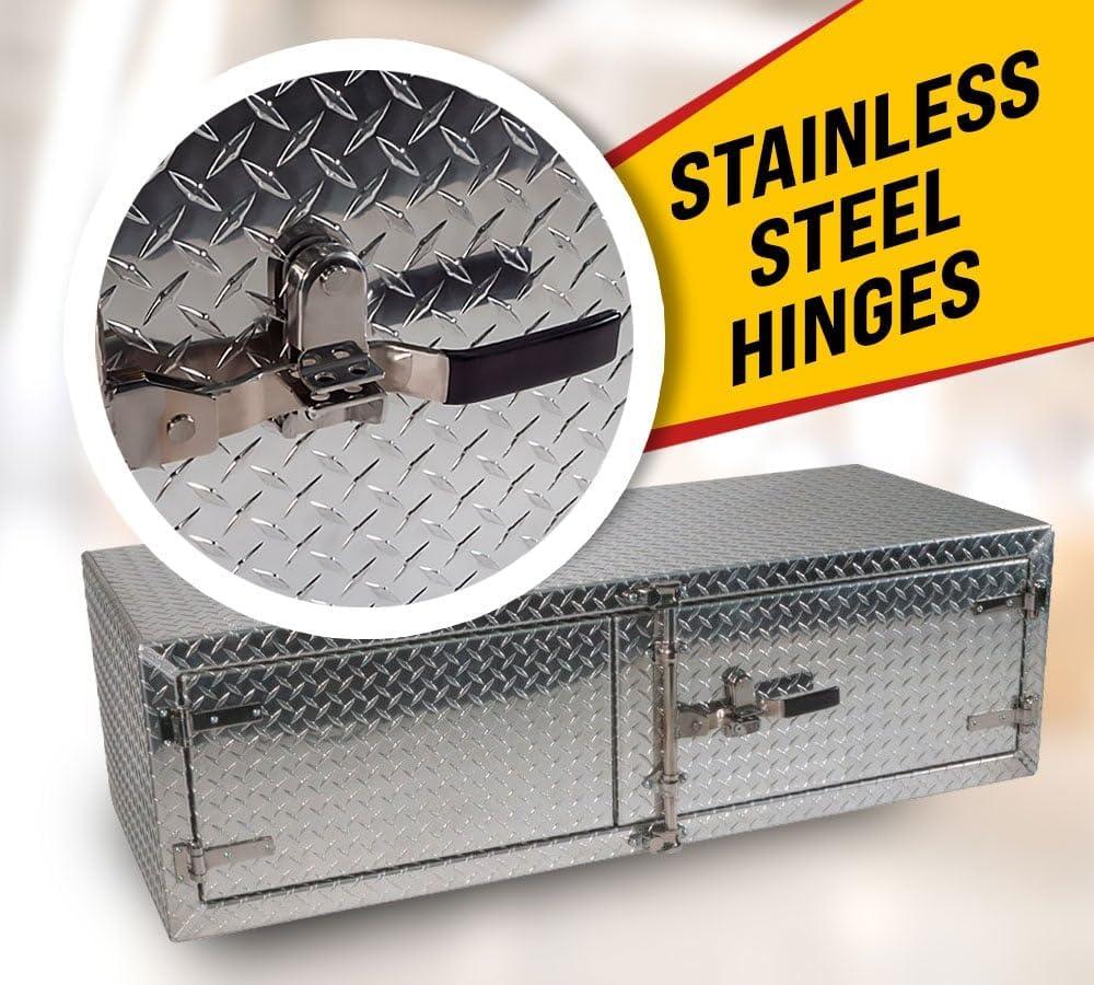 - Lightweight Aluminum Material: Our trailer toolbox is made from diamond checker plate aluminum with edges welded and reinforced. We have added heavy-duty stainless steel hinges on the double door to protect it from corrosion and other environmental elements. It gives strength while ensuring the free movement of the doors. The trailer box is strong enough to handle the wear and tear of the roads.