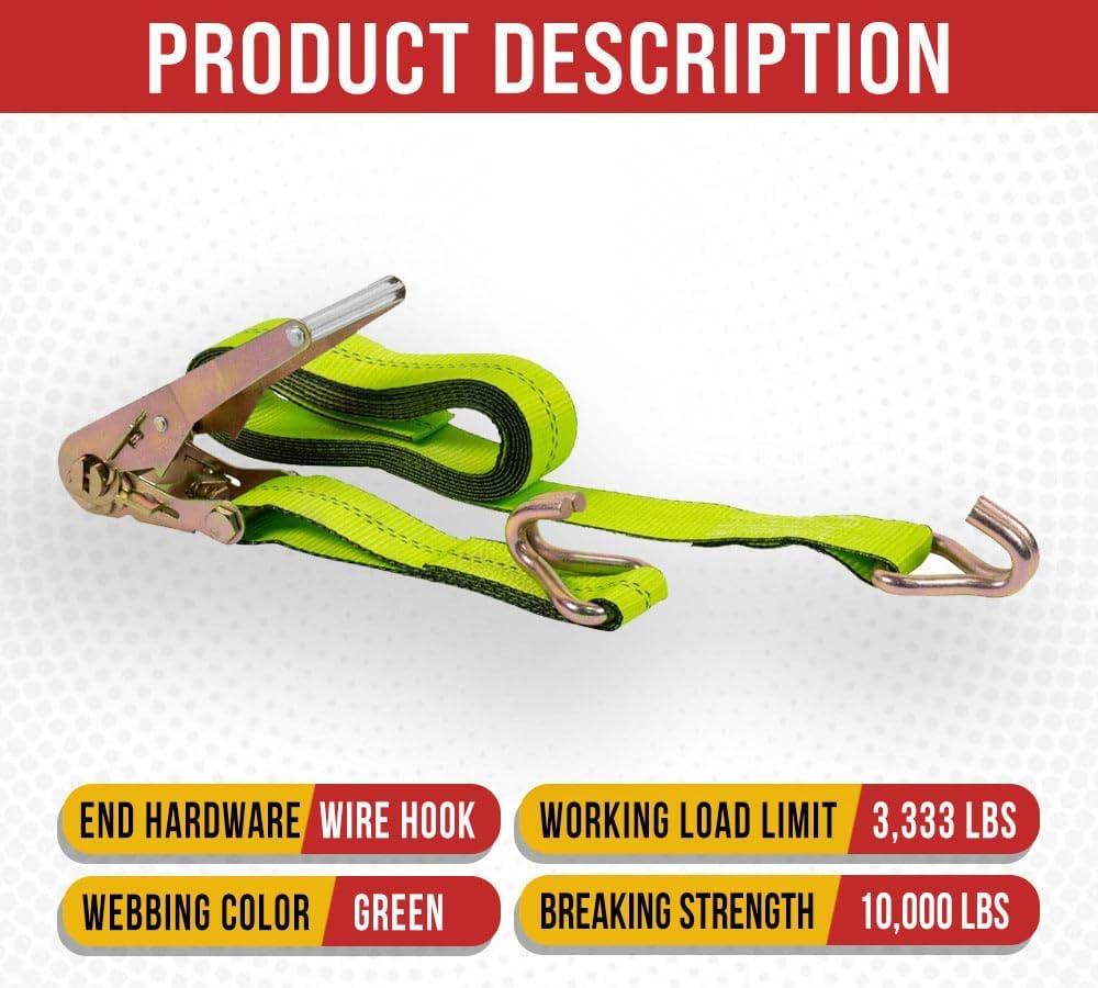 Mytee Products (2 Pack) 2 in. x 15 ft. Ratchet Straps with Wire Hook - Safety Green Flatbed Truck Tie Down 3,333 lbs # WLL(HI Viz Green)