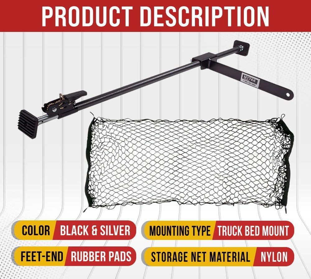 Mytee Products 2 Pack 40″-70″ Ratcheting Cargo Bar for Pickup Truck Bed with 60″x24″ Storage Net – Adjustable Load Lock Bars – Truck Bed Cargo Stabilizer Bar for Semi Trailers, SUV & Bed Divider(2 – Pack)