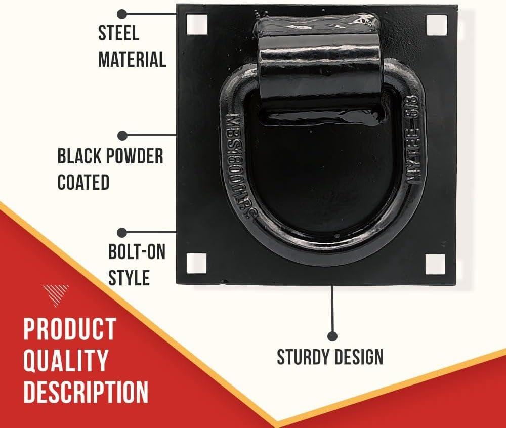 • Sturdy Design: Made of sturdy forged steel, this D-ring is long-lasting, dependable, and able to support large loads. Its sleek appearance and improved corrosion resistance are attributed to its black powder-coated finish.