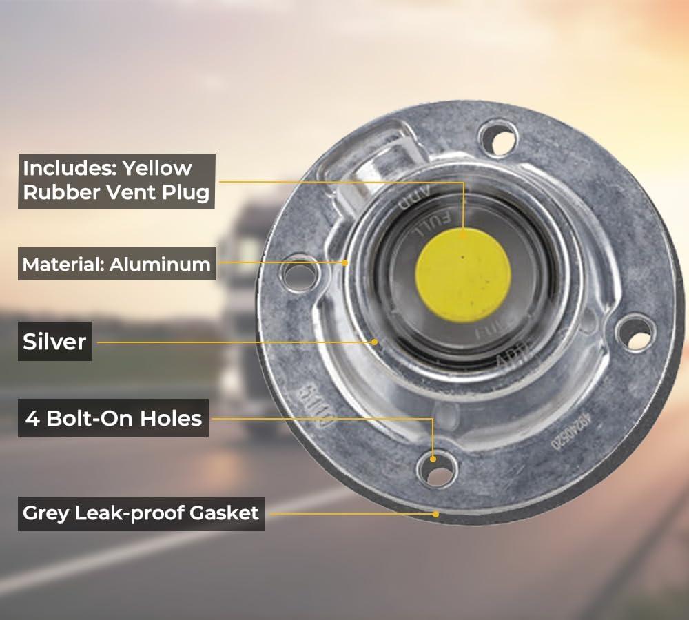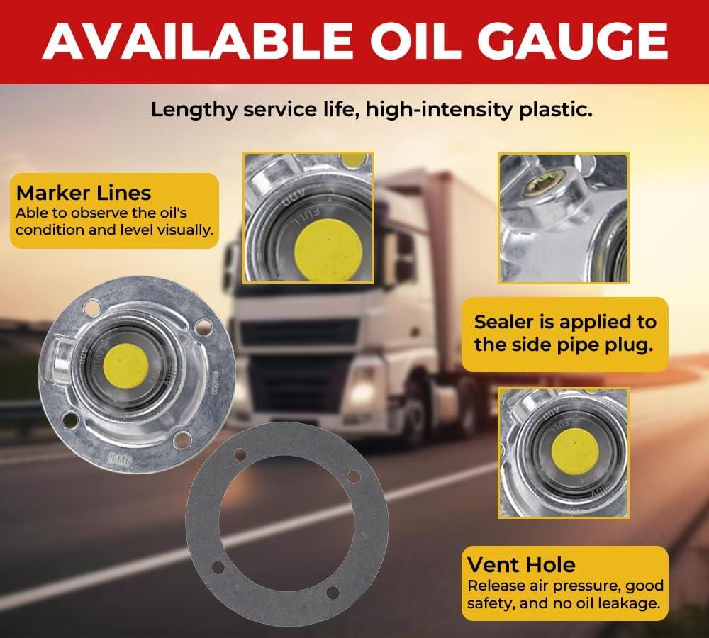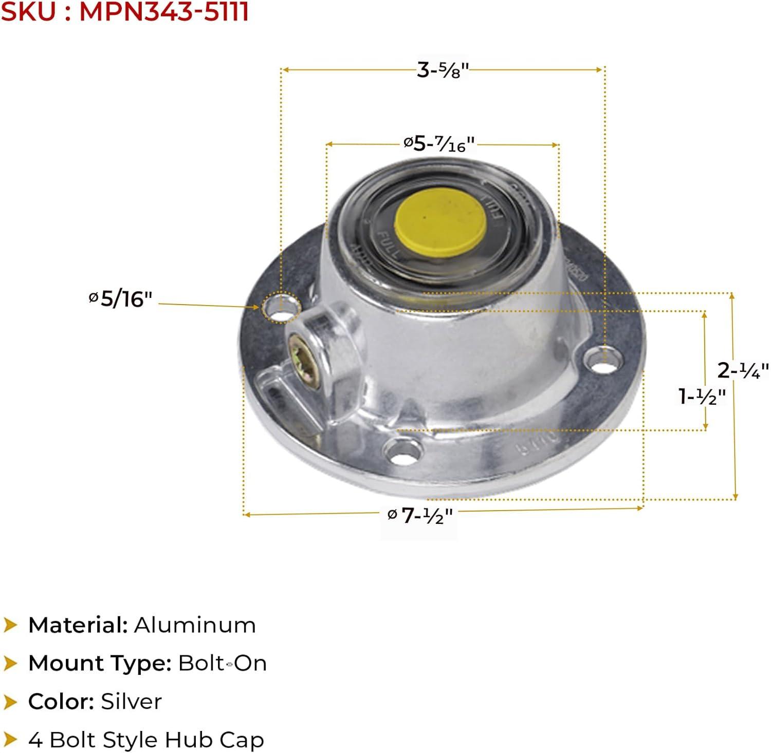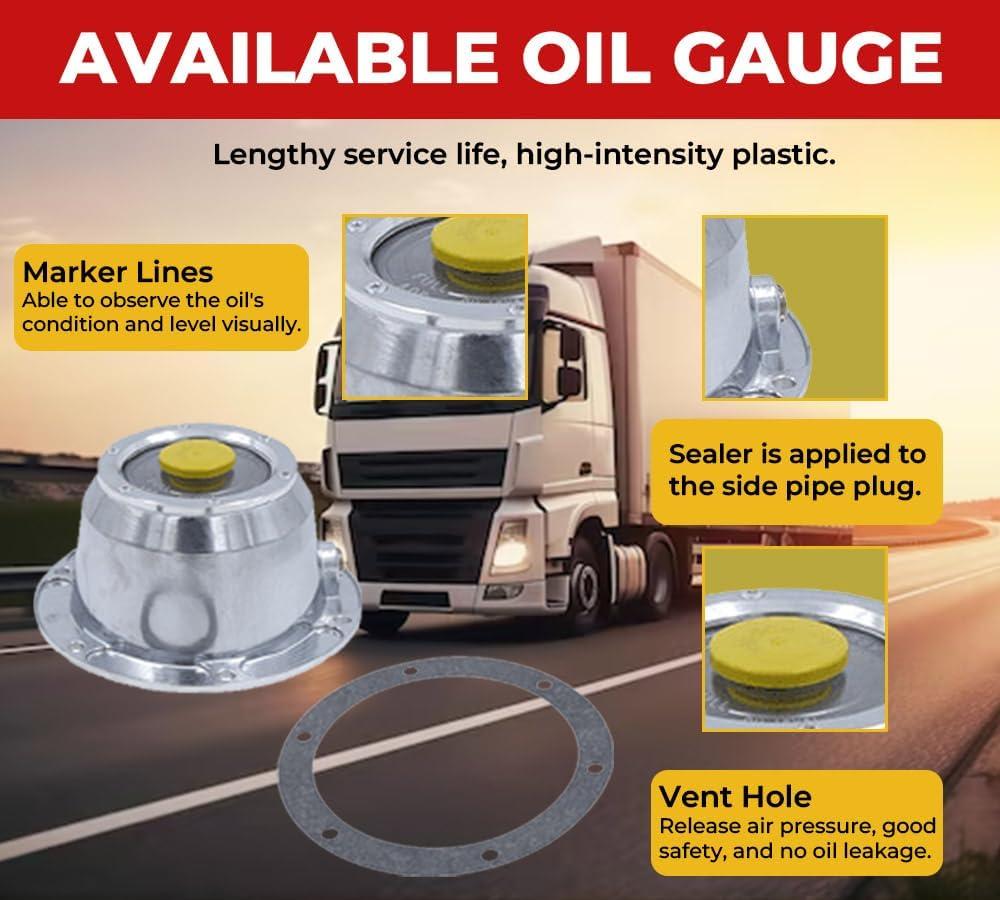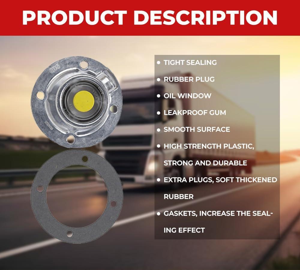 We introduce Aluminum Trailer Hub Cap Replacement for Stemco 343-5111, 3435111 w/ Gasket & Rubber Vent Plug. These hub cap trailers are specifically designed to fit over the center of a vehicle’s wheel, enabling you to transfer oil from the leak-proof yellow rubber vent plug (or side bolt space) for lubrication. The hub cap trailer has a transparent plastic window to monitor the oil quantity. Utilize this hub cap to replace specific makes and models, and brands—check the complete list below. Meanwhile, learn about detailed specifications below:-