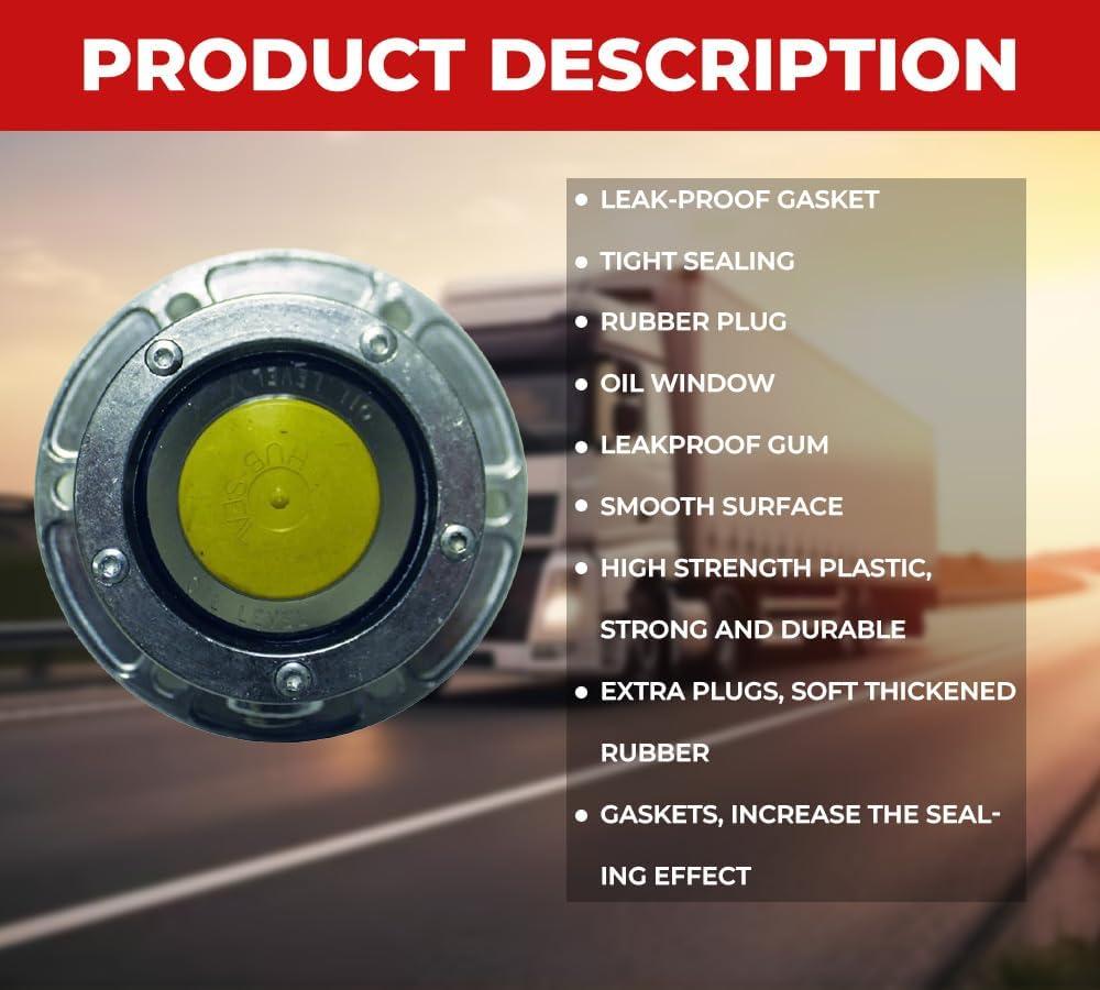 • Robust Construction: We have engineered our tractor-trailer hub caps from aluminum. It will ensure long-lasting performance and protect it against rust and corrosion. Meanwhile, other parts of the hub cap i.e. the vent plug are made from yellow rubber, and the transparent window is made from plastic. All the parts and its material will ensure uninterrupted efficiency for a long time.