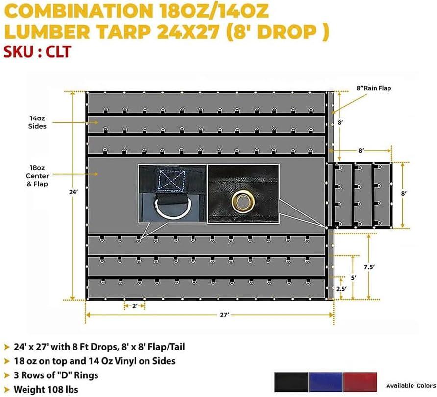 Mytee Products 24' x 27' Blue Lumber Tarp for Truck Cargo - Combination of 18 Oz/14 Oz Vinly Flatbed Tarps with 8' Drop - Waterproof Tarp for Trailers to Protect Cargo from Wind, Rain, Snow and Sun(Black)
