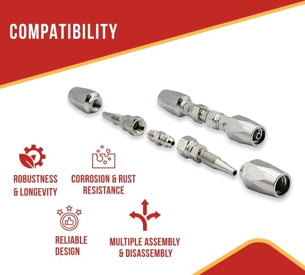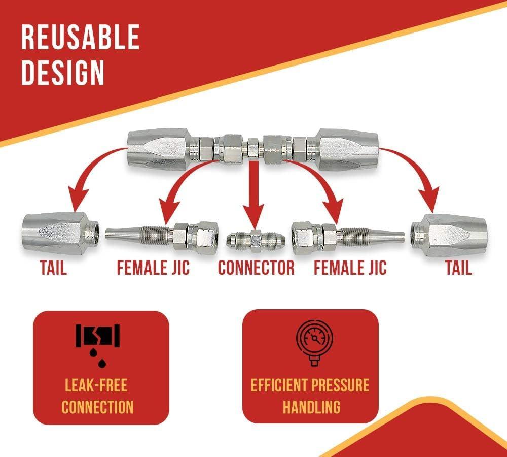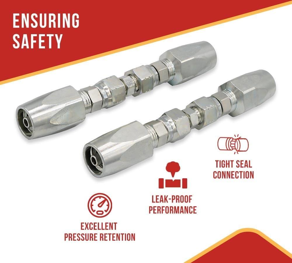 If you need hydraulic fittings for R2, R16, R17, R19 2-Wire Hydraulic Hose? Then you’re at the right place, we have added a Reusable Hydraulic Hose Kit – 3/8″ Steel Female JIC w/ Adapter – Sold in Pairs. You can now use it to connect sections of hydraulic hoses or pipes, ensuring leak-proof performance and efficient pressure retention. You can assemble and disassemble hydraulic fittings multiple times, making them reusable. These hydraulic hose fittings offer more features and specifications, read it below:-