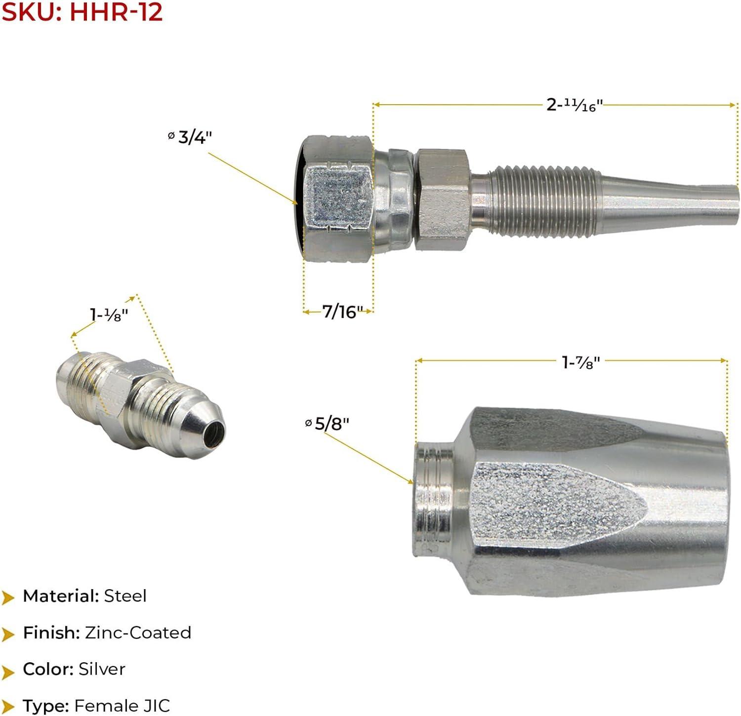 • Compatibility and Replacement: These hydraulic hose pipe fittings are compatible with R2, R16, R17, R19 2-Wire Hydraulic Hose and 2SN/2SC Hydraulic Hose. Hoses with an inner diameter of 3/8″ (outside diameter – 3/4″) will fit inside the female JIC and you can use an adapter to connect two female JIC. Additionally, you will find these fittings with Pehel reusable part numbers: 26718D-06-06R2 (Female JIC) and 1J-06 (Tail/JIC adapter). It’s ideal for SAE 100 R2 hose models.