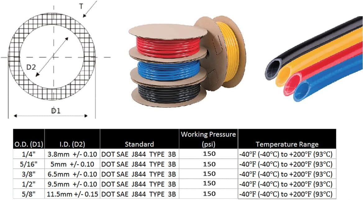 DOT COMPLIANT: Meets or exceeds SAEJ844 (Type A- non-reinforced & Type B – reinforced). Air Brake Tubing indentified per SAE J844 & FMVSS No. 106 Brake Hoses, 49 CFR 571.106.