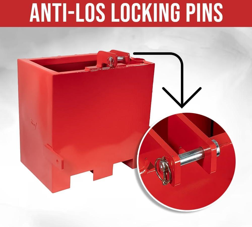 Quick and Easy Installation: The ballast box comes with included lift arm pins (1) and top link pins (2), making installation fast and tool-free, allowing you to quickly connect to your tractor for immediate use.
