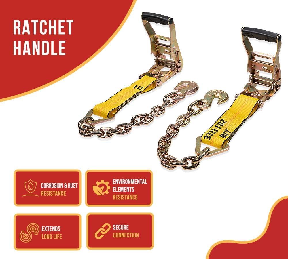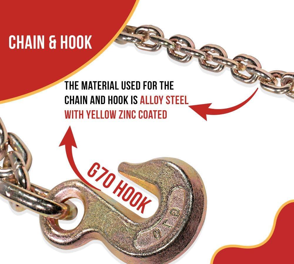 Corrosion-resistant Components – Gold chromate-plated ratchet, O-rings & chain anchor hooks prevent rust & damage from metals, ensuring the longevity of the heavy-duty steel construction.