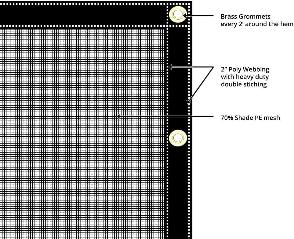 • EASY-TO-USE: Our mesh shade tarps have brass grommets spaced every two feet around the perimeter. The grommets are compatible with any ⅝ inch thick twine, cord, or wire rope you might use to set up or anchor the tarp.