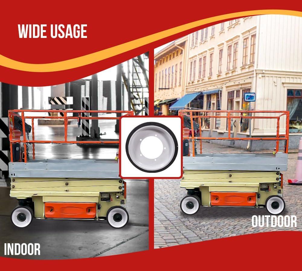 - Wide Usage: As mentioned above, our tires offer seamless efficiency in indoor and outdoor environments, including varied surfaces. You can use scissor lifts’ tires in warehouses, factories, airports, construction sites, stadiums, event venues, etc.