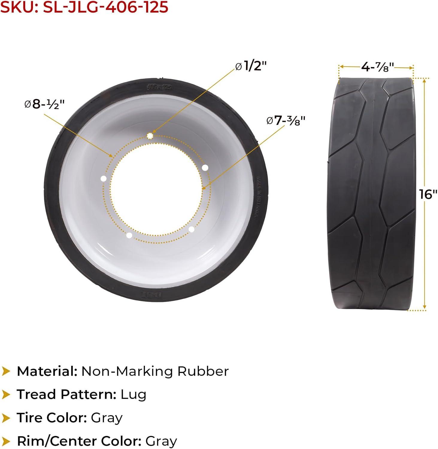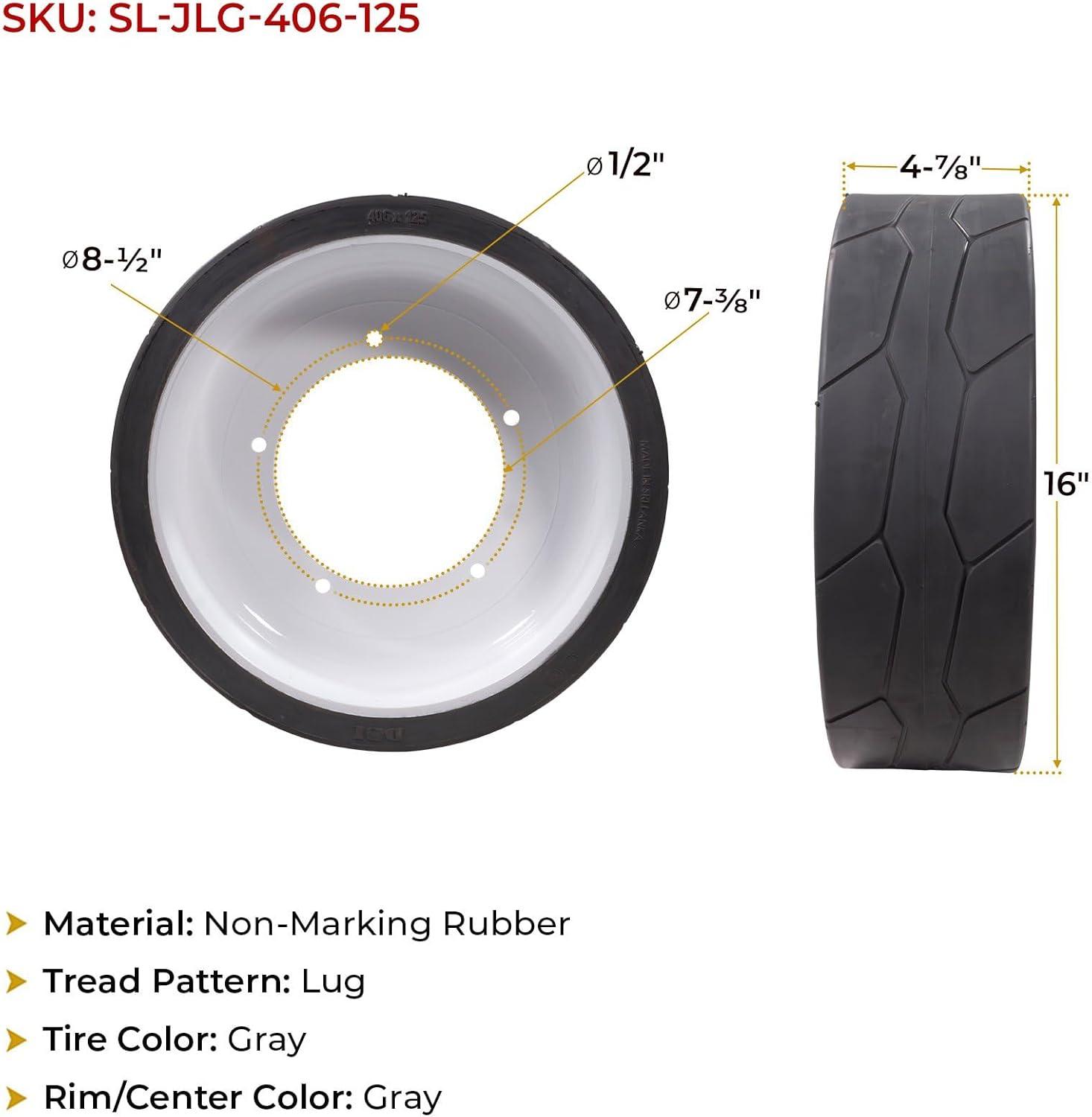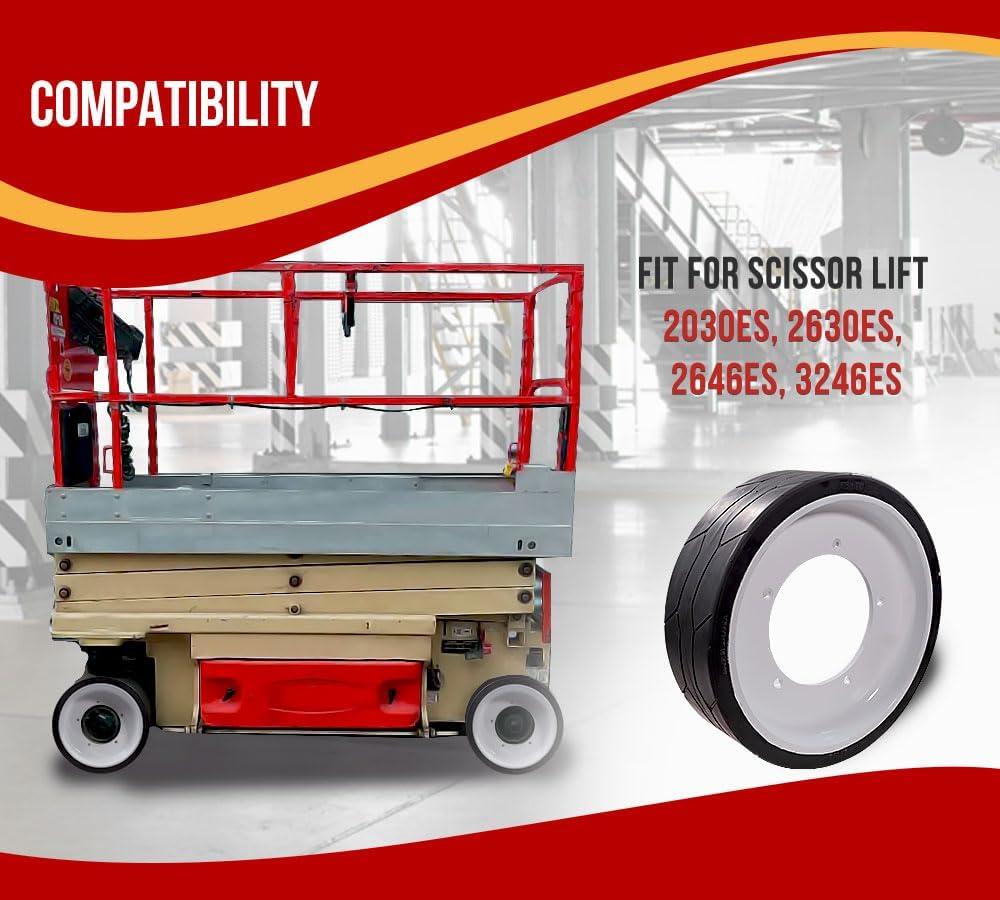 - Enhanced Visibility: We have designed these gray tires to differentiate them from standard tires. Meanwhile, the rim color is white. Additionally, the tread design will enable the scissor lifts to provide versatility across various surfaces. These treads will provide high stability, traction, and minimal impact on the surface.