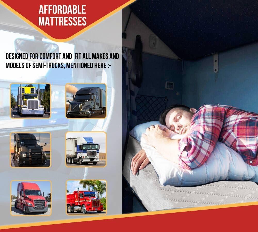 • Truck Compatibility: These foam mattresses are highly affordable and designed to provide the utmost relaxation and support during the journey. You can fit our mattresses in all makes and models of semi-trucks. Whether you drive Peterbilt, Volvo, Mack, International, Freightliner, Kenworth and Western Star, our mattress will fit with all. It’s perfect for professional truck drivers who require the right sleep during the journey.