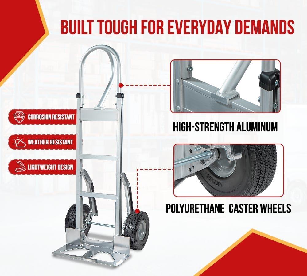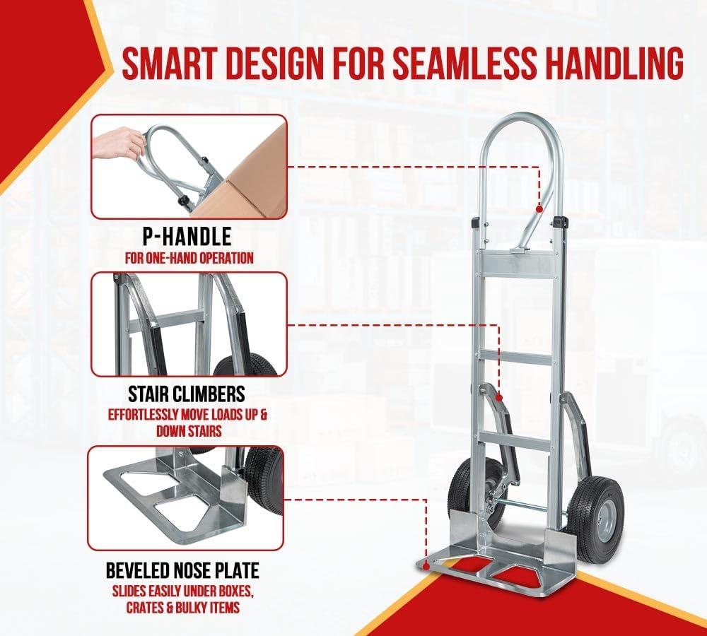 • One-Hand Operation: Our hand truck includes a P-handle for one-hand operation, keeping your other hand free. It will help you open the door, stabilize the loads, or perform different tasks. Additionally, the P-handle will provide a comfortable and ergonomic grip, allowing you better control and reduced strain on your hands and wrists.