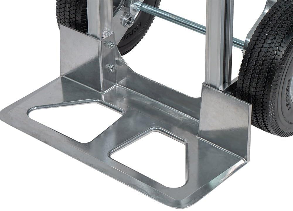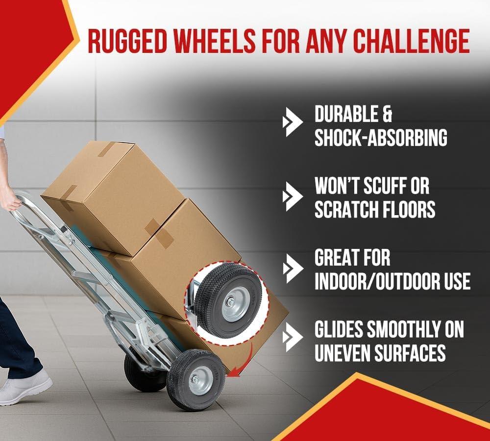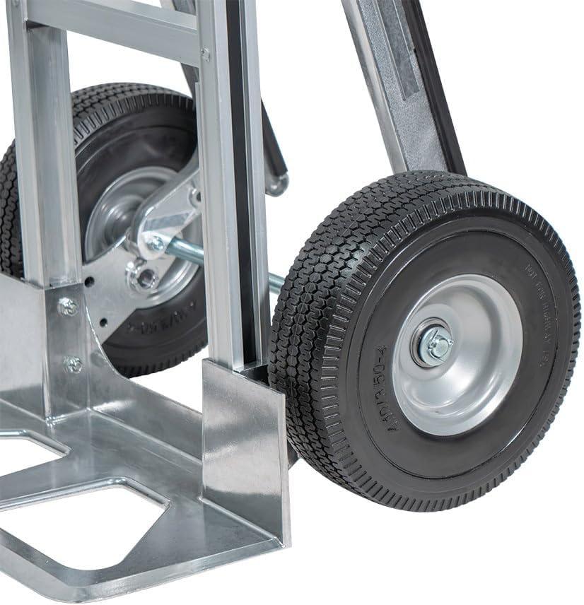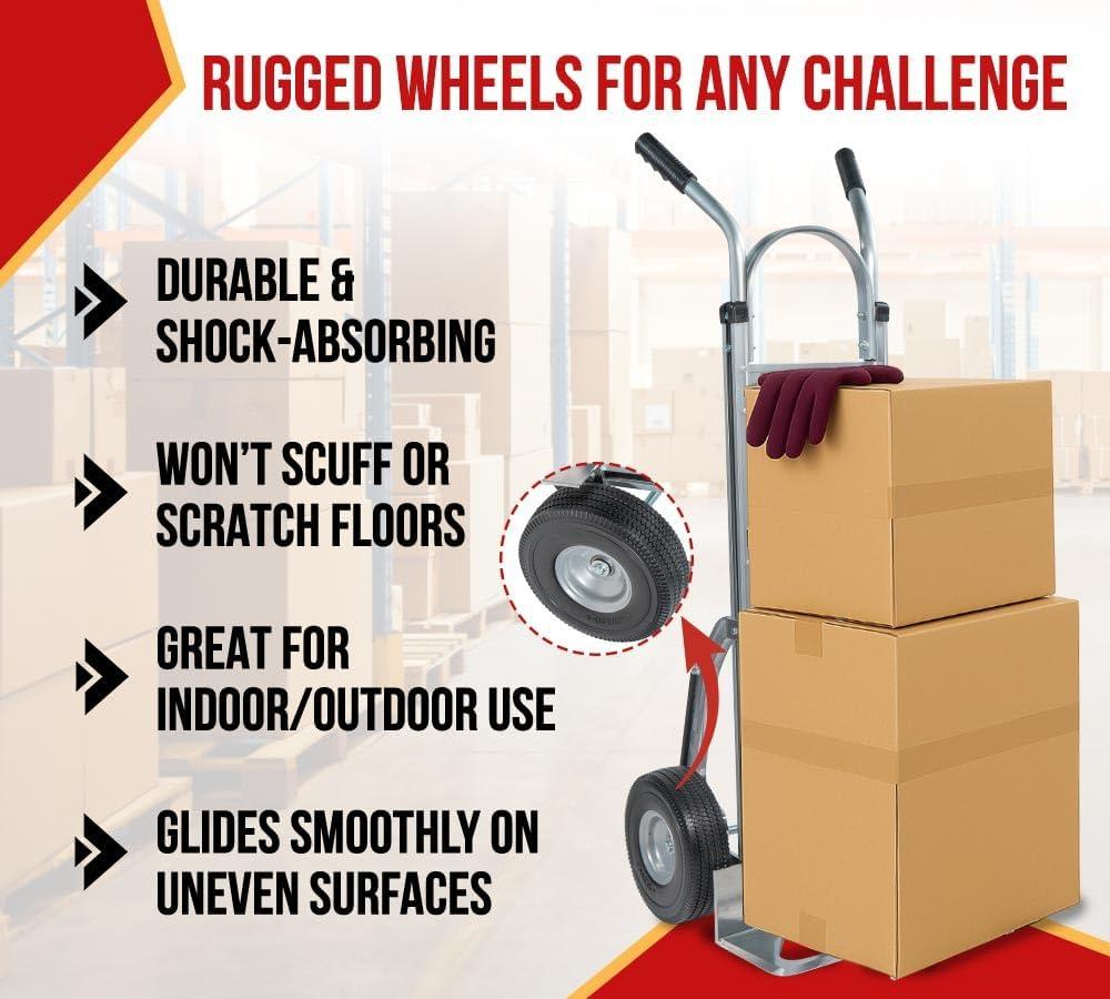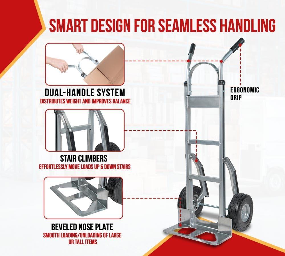 • Includes Stair Climbers: Our hand truck has an aluminum stair climber that eases the operation and transportation of loads/goods up and down the stairs. It will enable you to smoothly navigate the steps, reducing the physical strain and effort required by the user. Additionally, reducing the risk of the hand truck tipping over.