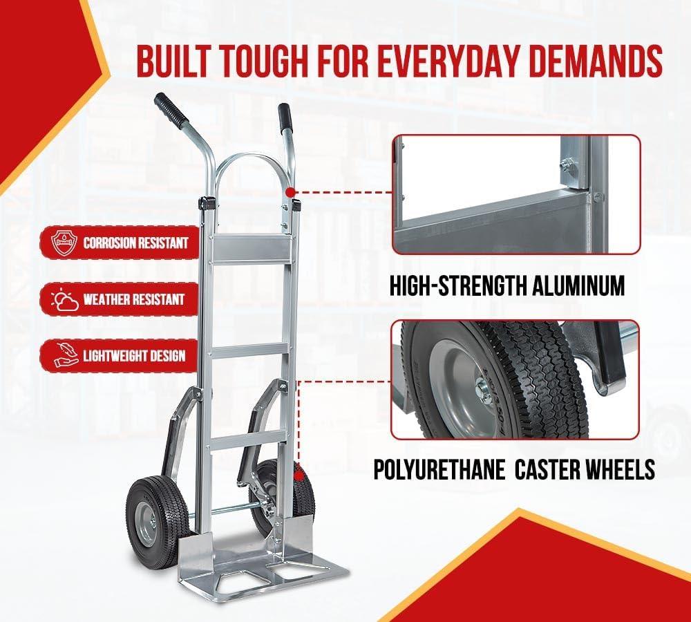 • Weight Capacity: Our aluminum hand trucks offer excellent durability and are designed to handle a weight capacity of up to 600 lbs. You can easily maneuver the goods/parcels up to the mentioned load capacity; exceeding the limit is not recommended.