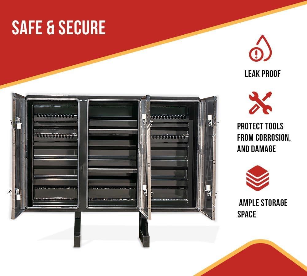 • Leak Proof: We have used a weather seal – an air-tight rubber seal that prevents water and liquid substances from entering or leaking out of the box. It will protect your tools and equipment from dust, debris, rust, corrosion, and damage. It’s a practical feature of our cab rack, playing a significant role in protecting them.
