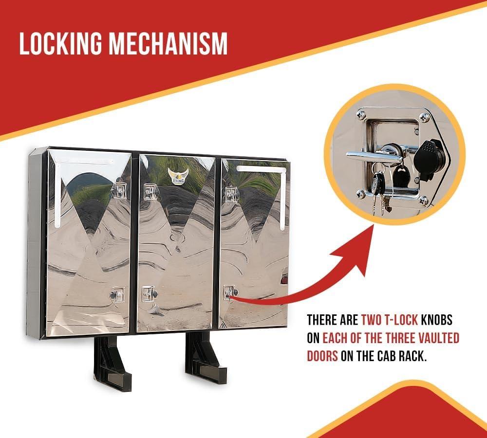 • Locking Mechanism: Our vaulted cab rack with three doors includes two T-lock handles on each vaulted door to ensure tight closing and protect the equipment inside. You will receive two keys in each handle.