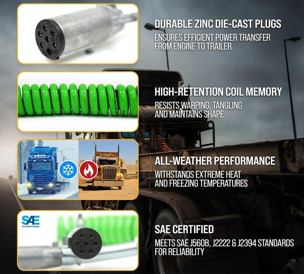 ✔ MEETS OR EXCEEDS STANDARDS. The 7-Way ABS Coil meets or exceeds relevant J560B, J2222 & J2394 standards set by the Society of Automotive Engineers (SAE).