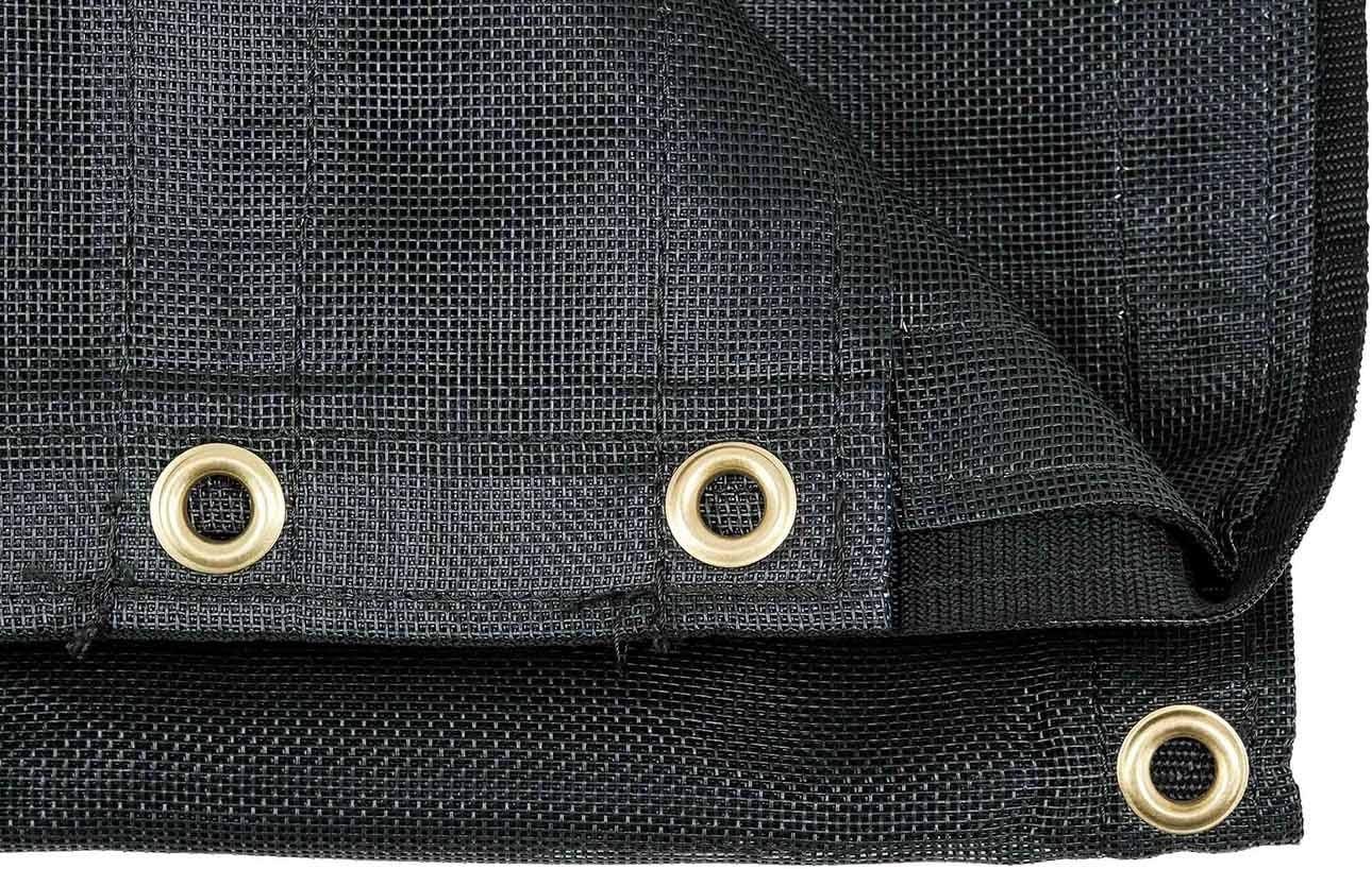 • Vinyl Tough solid #4 brass grommets clinched every two feet. All hems are re-enforced with 2″ thick polyester webbing