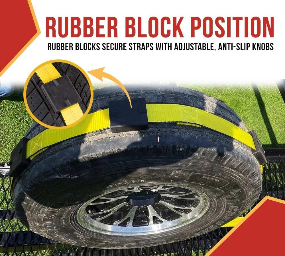 Effective Load Positioning: The sliding rubber blocks ensure proper placement on the tire & additional load stability during transport for these auto hauler straps.