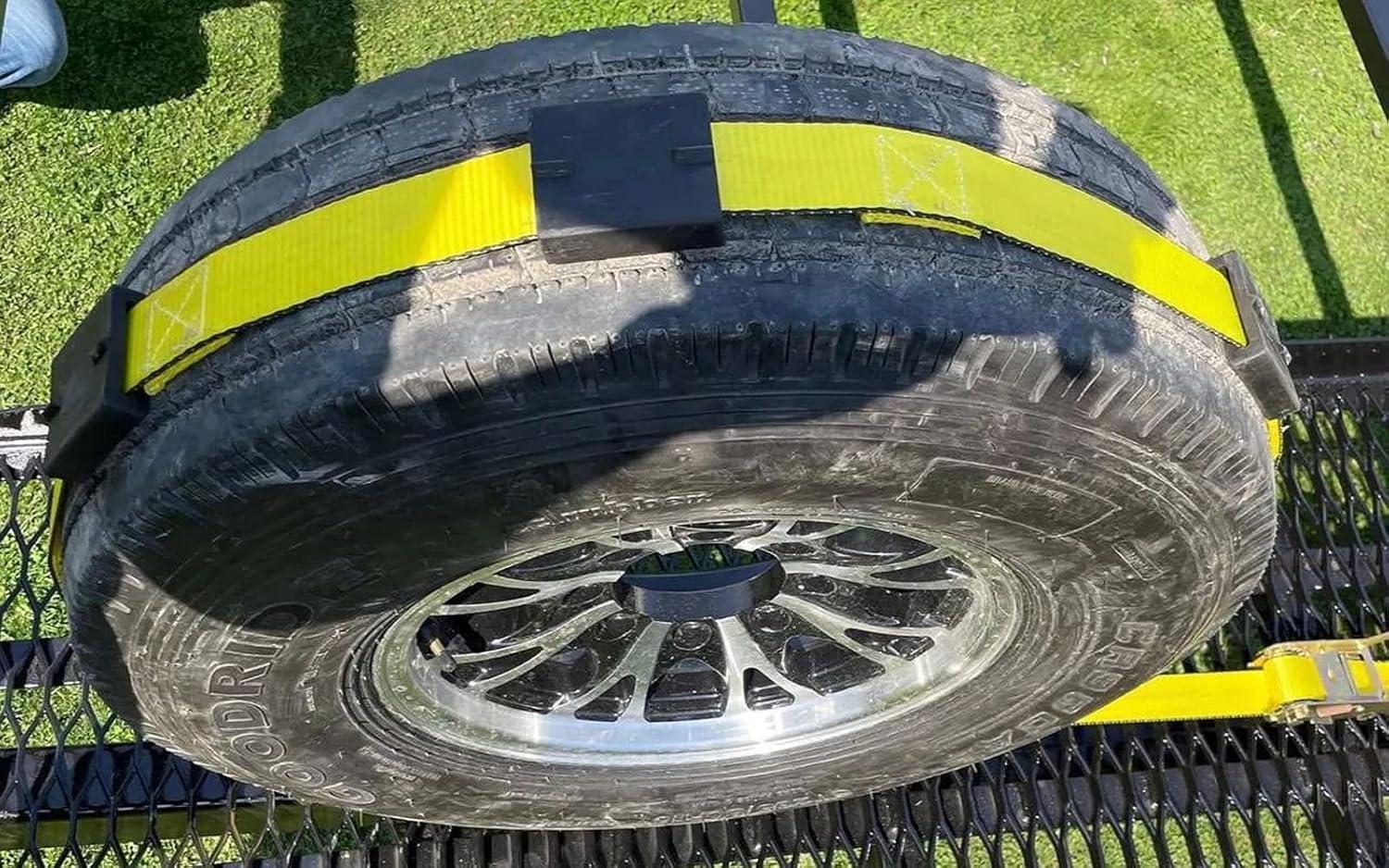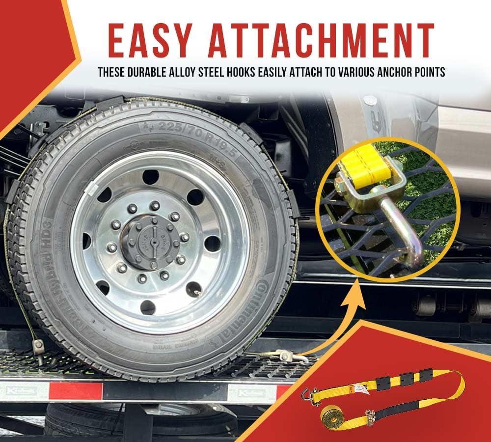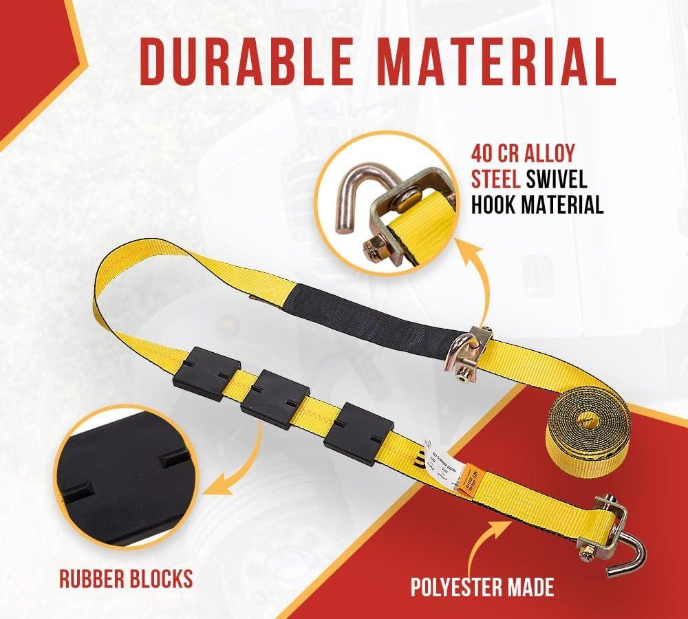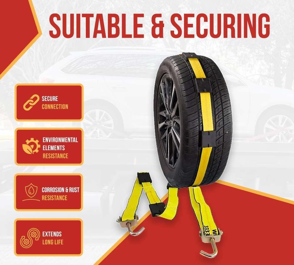 Durability & Resistance: Made with high-quality polyester webbing, these tire tie down straps over the wheel resist damage from scrapes & cuts, offering long-lasting durability.