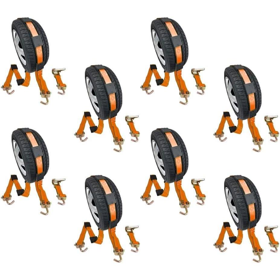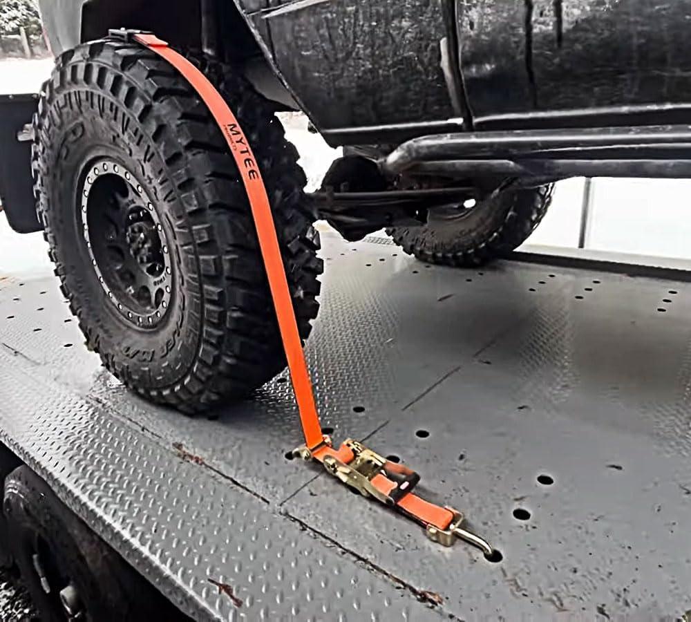 Mytee Products 8 Pack 2″ x10′ Car Tie Down Straps for Trailers with Ratchet – 5,000 LBS Breaking Strength Over The Tire Wheel Straps for Auto Car Haulers, UTV, Truck Trailer Bed(4 – Pack)