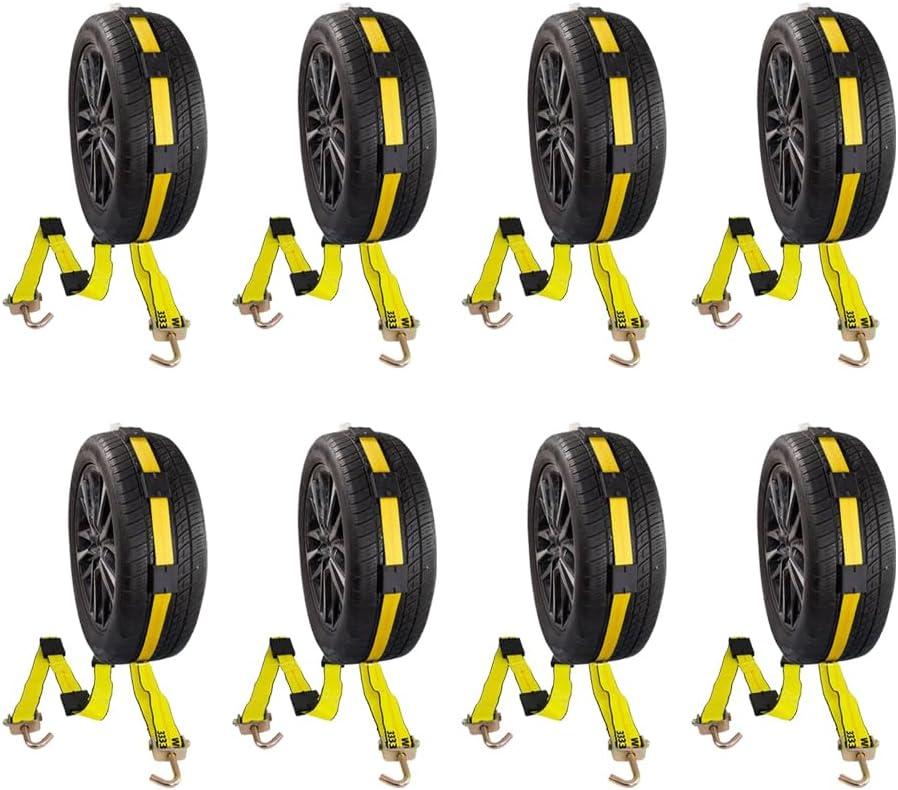 imageMytee Products 8 Pack 2quot x10 Car Tie Down Straps for Trailers with Ratchet  5000 LBS Breaking Strength Over The Tire Wheel Straps for Auto Car Haulers UTV Truck Trailer BedYellow