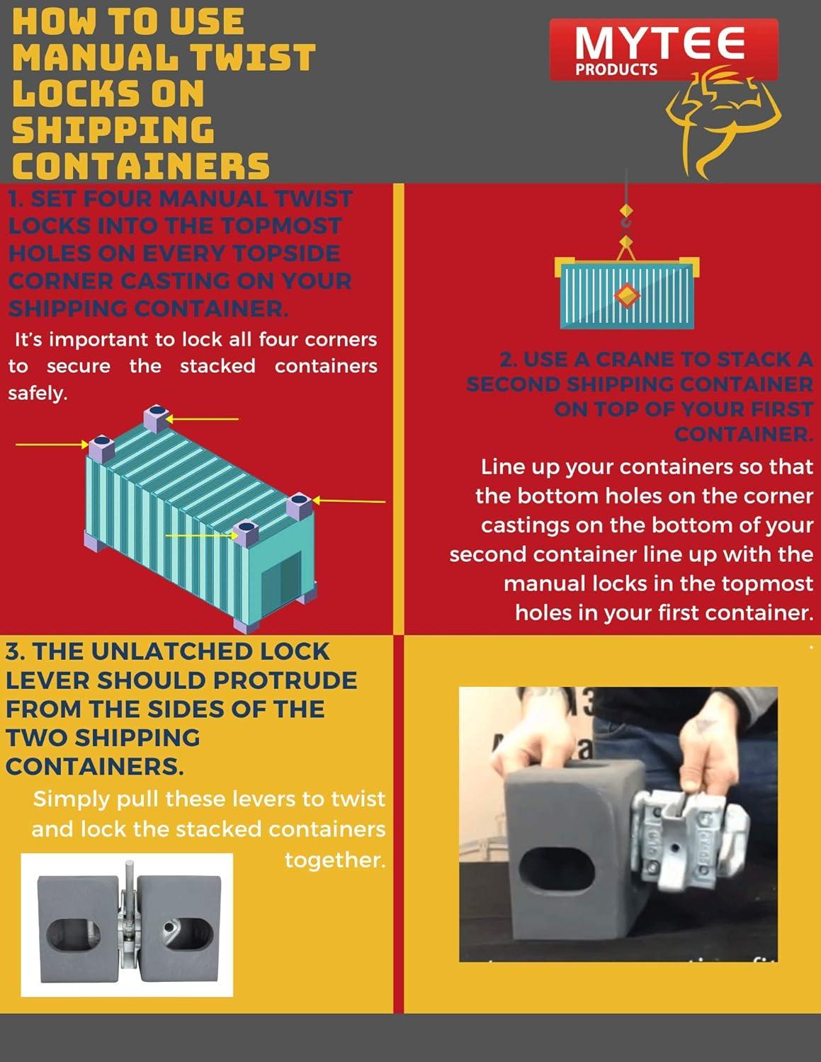 • COST-EFFECTIVE. Keeping shipping containers locked and secure is vital. But you don’t have to break the bank to do it! Mytee’s manual twist lock for shipping containers is guaranteed quality, without the price tag. Ship smart, use Mytee, save money.