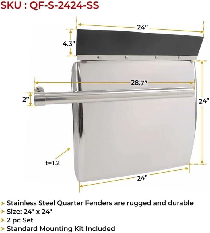 Mytee Products Black Poly Quarter Fender for Semi Truck Set 24"x24" - Standard Mounting Tube Bracket Kit Included - Semi Truck Accessories for Kenworth Freightliner Peterbilt (Set of 2)(Stainless Steel Quarter Fender)