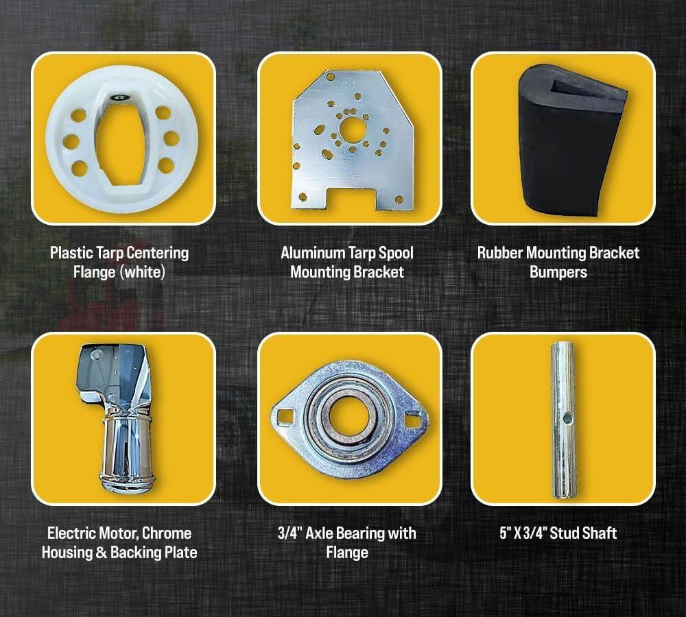 Included Components Aluminum Parts, Tarp Switch Kit, Pivot Pins 4-Spring, Spiral torsion springs, Axle Mounting Brackets, Stainless Steel Bushings, 12V 50:1 600W Electric Motor, Dump Bed