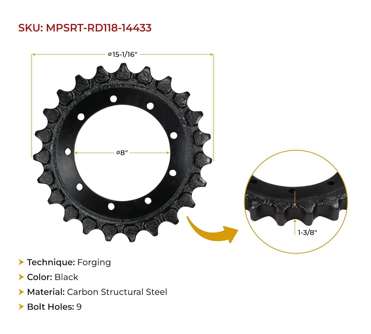 • Manufactured with Exact OEM Specifications: These heavy-duty sprockets are designed to the exact OEM quality standards and specifications of Kubota Models and part number RD118-14433. It includes 9 bolt holes and 23 teeth for efficient operation in challenging terrains. Available for compact machinery like mini excavators.