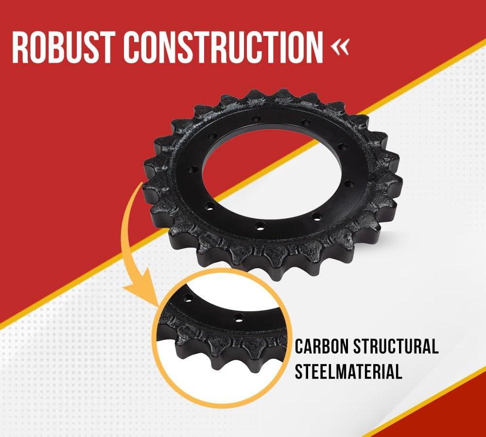 - Forged for Strength: All our mini excavator sprockets are engineered with 40Mn Carbon Structural Steel. Constructed with a forging process to make them highly durable. It can withstand heavy loads, ensures smooth functionality, and high performance in rough terrains.