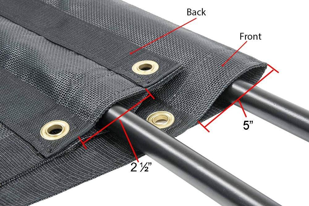 (1) 7″ x 14' PVC Mesh Tarp for Dump Trucks:- Top 5″ Pockets Made with 18 Oz Vinyl and Bottom Pocket 2-1/2″, Tough solid #4 brass grommets clinched every two feet, All hems are re-enforced with 2″ thick polyester webbing.