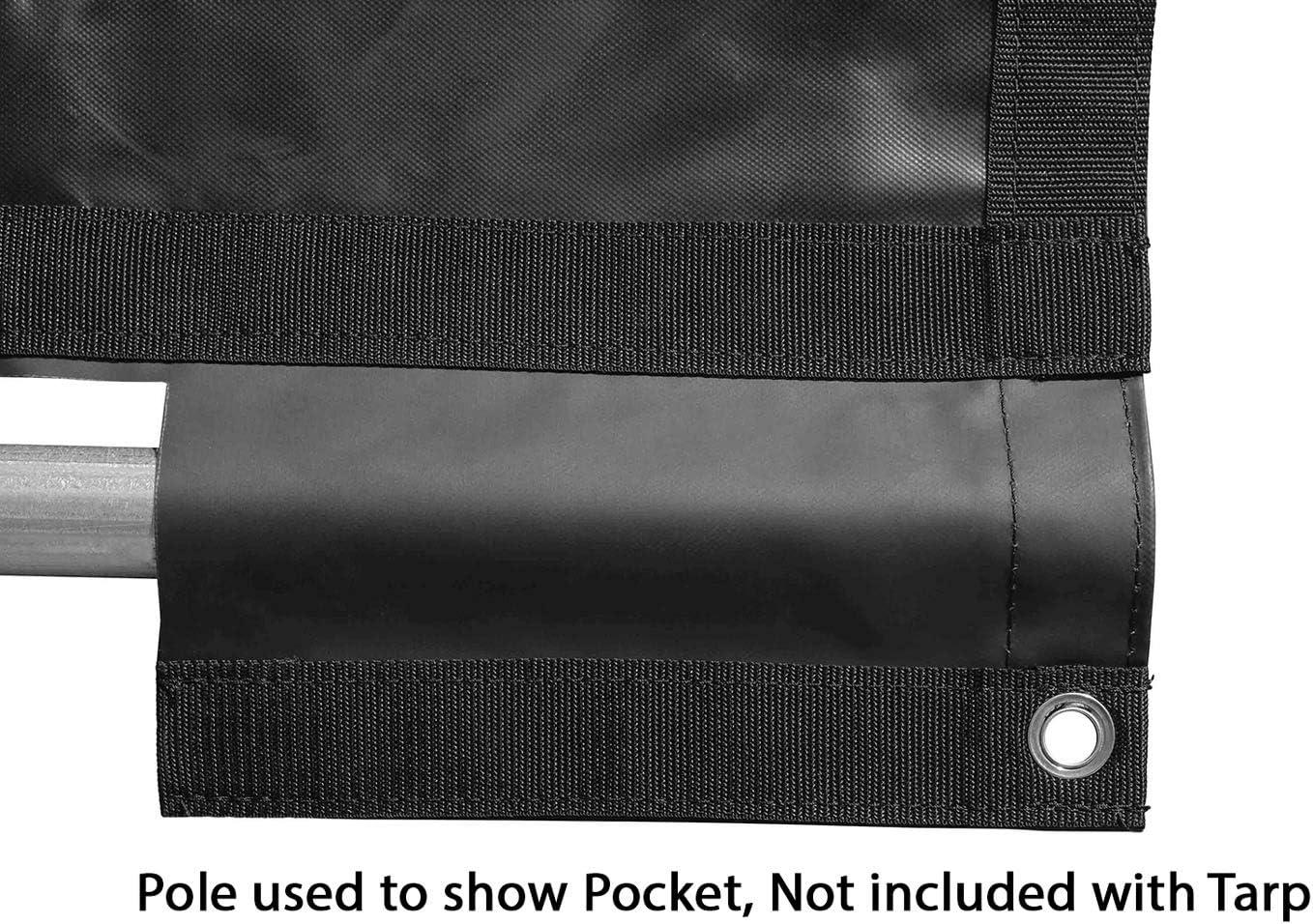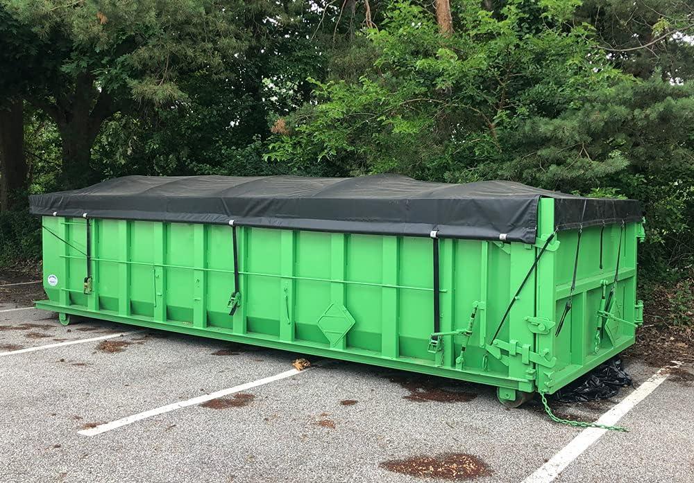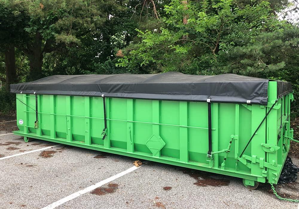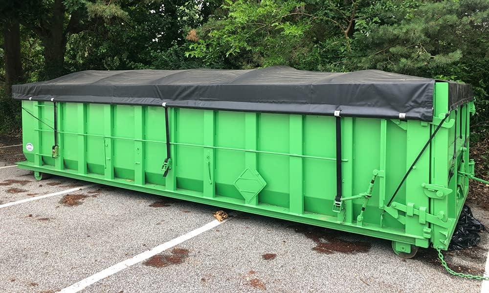 - Our Roll Off Dumpster Tarps are made to have a 1' drop on each side when properly used. All four sides have gromets along the outter edge every 2', giving you ample tie-down points. Heavy duty 18oz vinyl is completely waterproof for complete protection.
