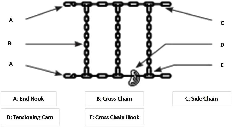 Cam Tire Chains – The four outside tensioning cams contribute to a secure & snug fit around the tires. This ensures that the wheel chains for snow remain properly aligned & in place, minimizing the risk of slippage or disengagement during operation.