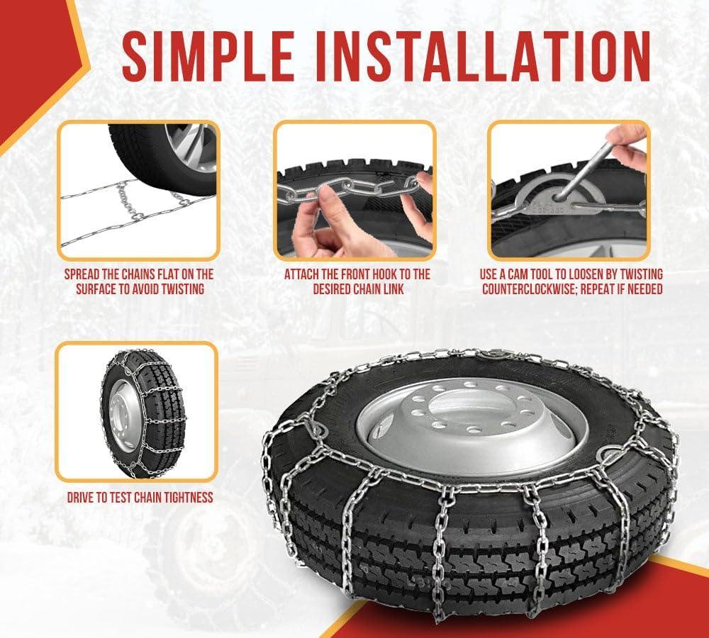 Enhanced Traction – With 14 cross links per tire chain, these chains deliver excellent traction roads. The steel twist link design effectively grips the surface, enhancing the stability of commercial trucks, SUVs & pickups in snowy or icy environments.