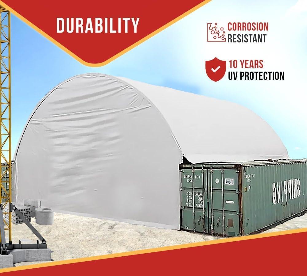Mytee Products Shipping Container Canopy Shelter Kit – 20′(L) x 20′(W) 21 Oz 610 GSM PVC White Cover Storage Container Roof with Back End Wall – Snow, UV and Weather-Resistant(18-3/8′ (H) x 26′ (W))