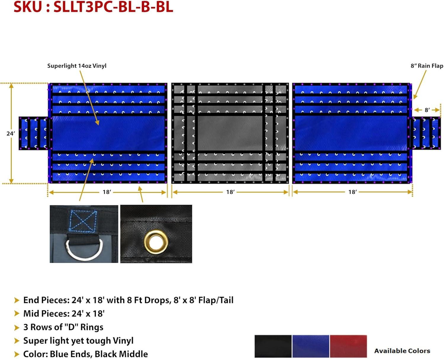 - End Pieces: 24' x 18' with 8 Ft Drop, 8' x 8' Tail and 8″ Rain Flaps