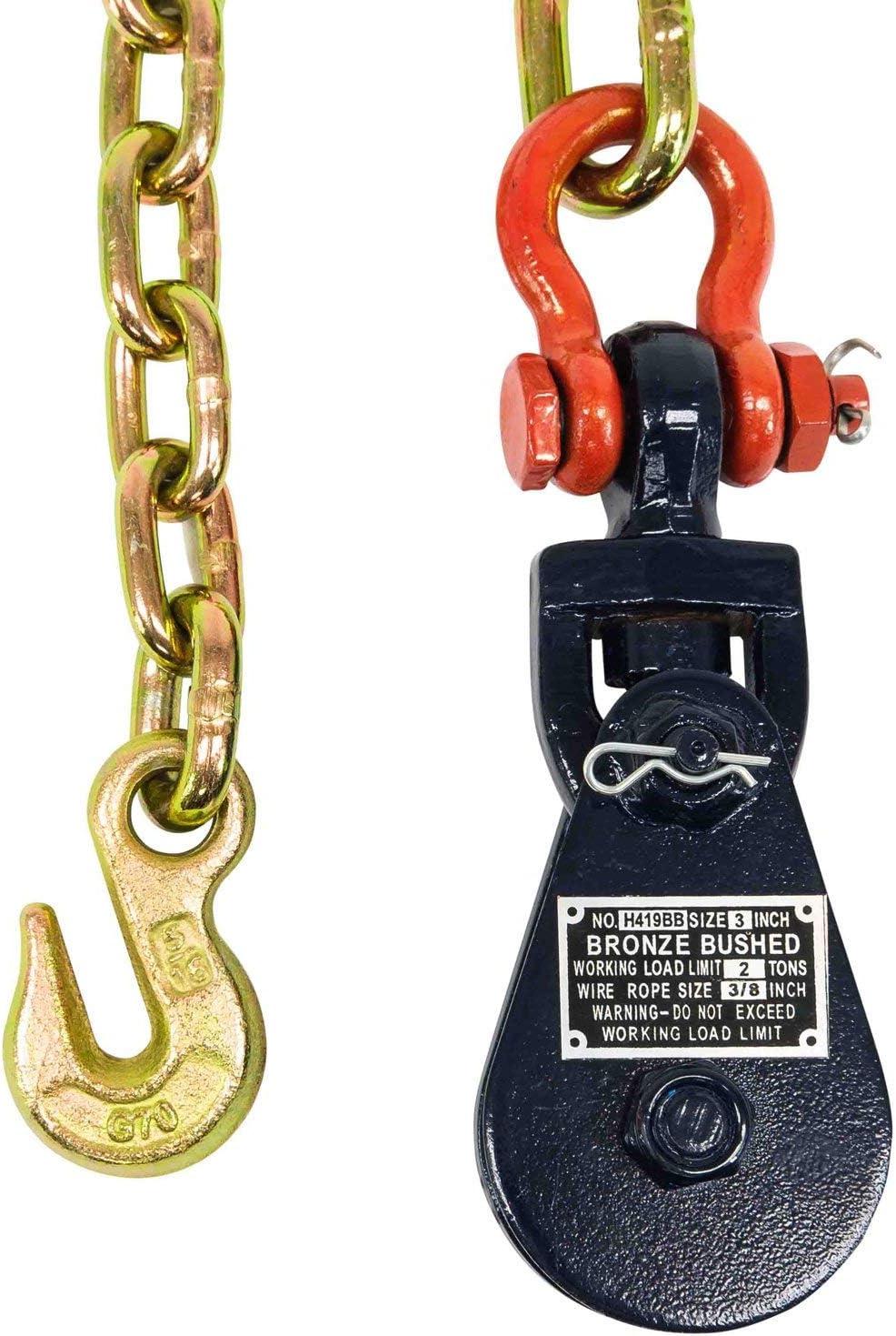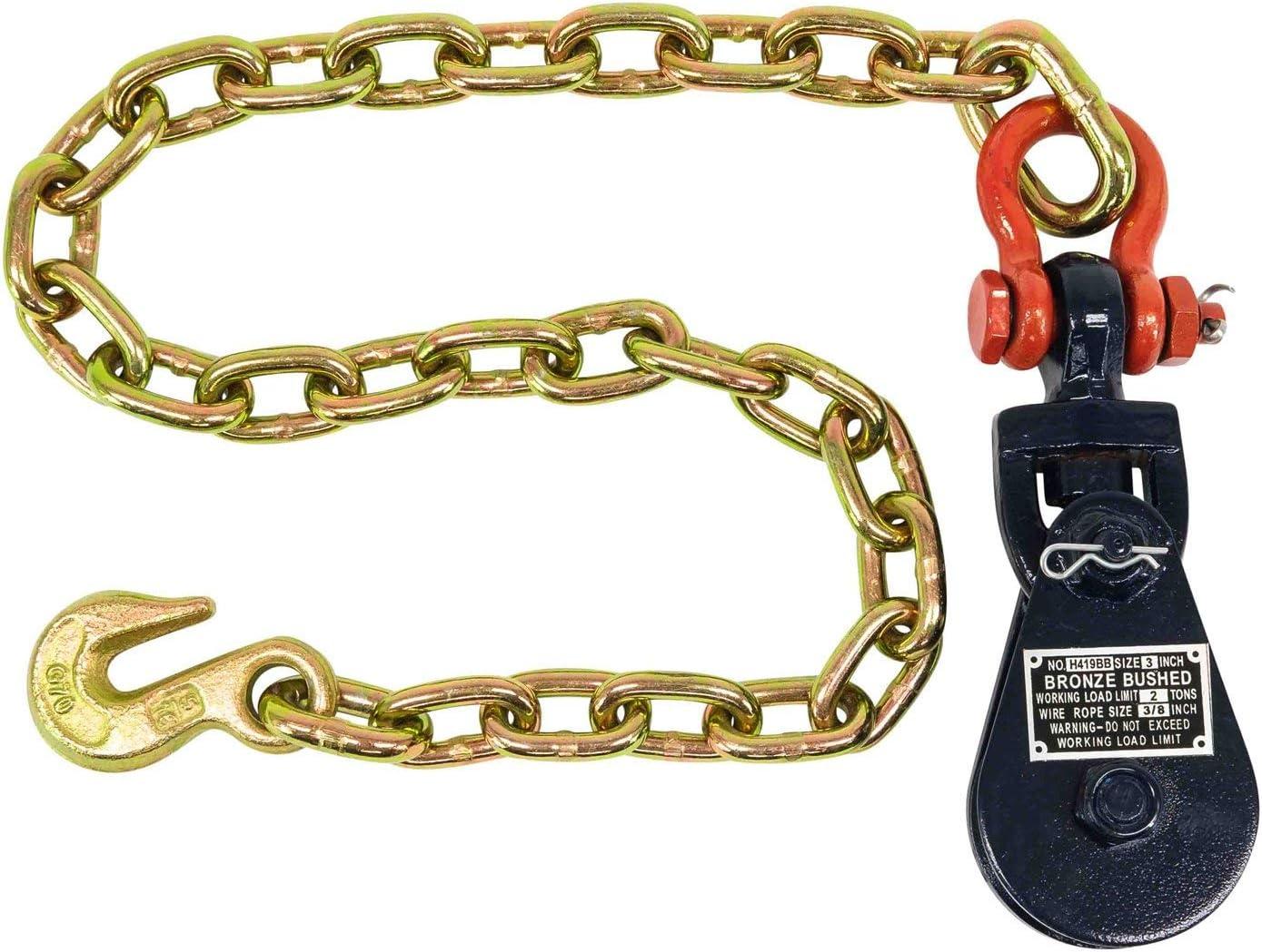 Sheave Size: 3″, Wire Rope: 3/8″, Working Load Limit: 2 Tons ,End Fitting: 2 ft G70 5/16 Chain Anchor, Comes With Grease Fittings