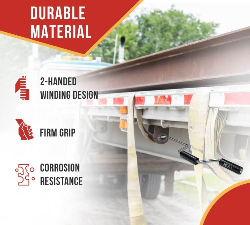 Non-Slip Swivel Handle: The strap winders for flatbeds include two swivel handles that are made from Polypropylene. It has a sturdy design, ensuring a firm grip while preventing your wrists from getting sore. The handles are attached to one end and middle drop of the winder.