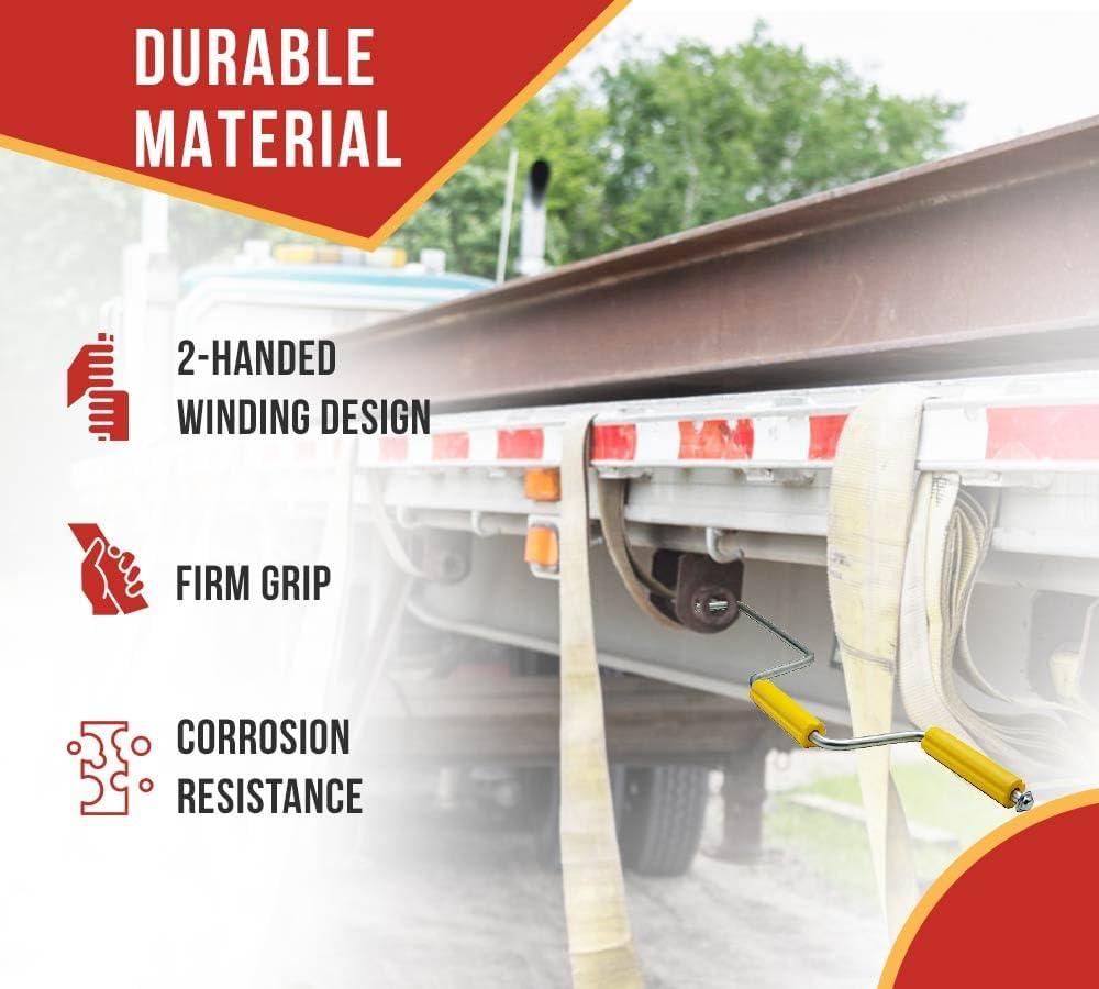 Non-Slip Swivel Handle: The strap winders for flatbeds include two swivel handles that are made from Polypropylene. It has a sturdy design, ensuring a firm grip while preventing your wrists from getting sore. The handles are attached to one end and middle drop of the winder.